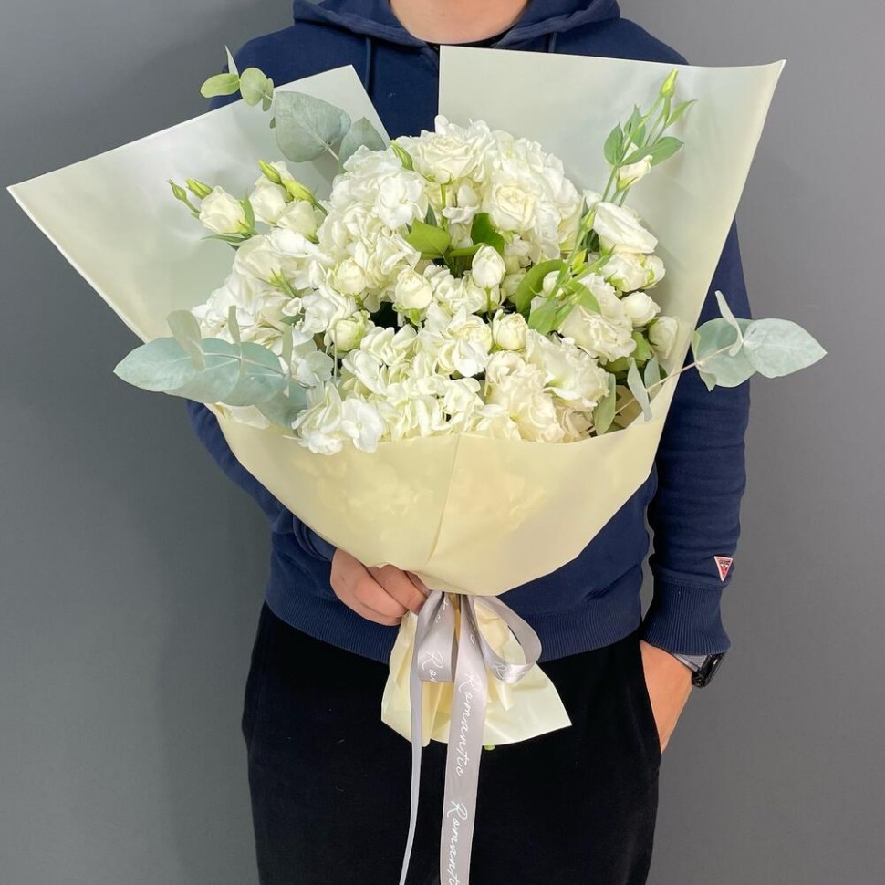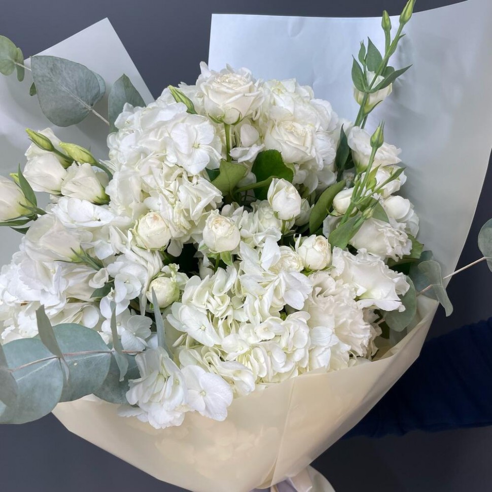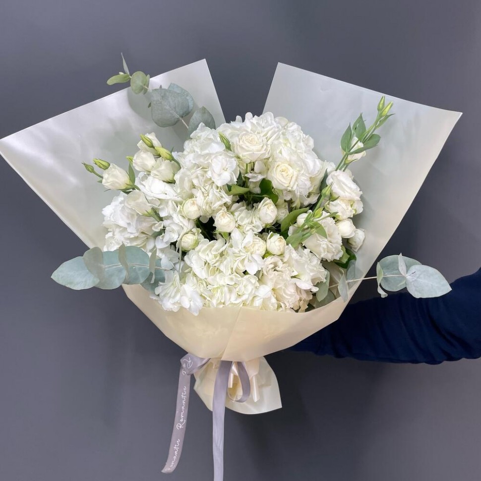 • Уникальный букет из гортензий белых и эвкалипта, а также кустовой розы белой — это прекрасный выбор для особенных случаев.