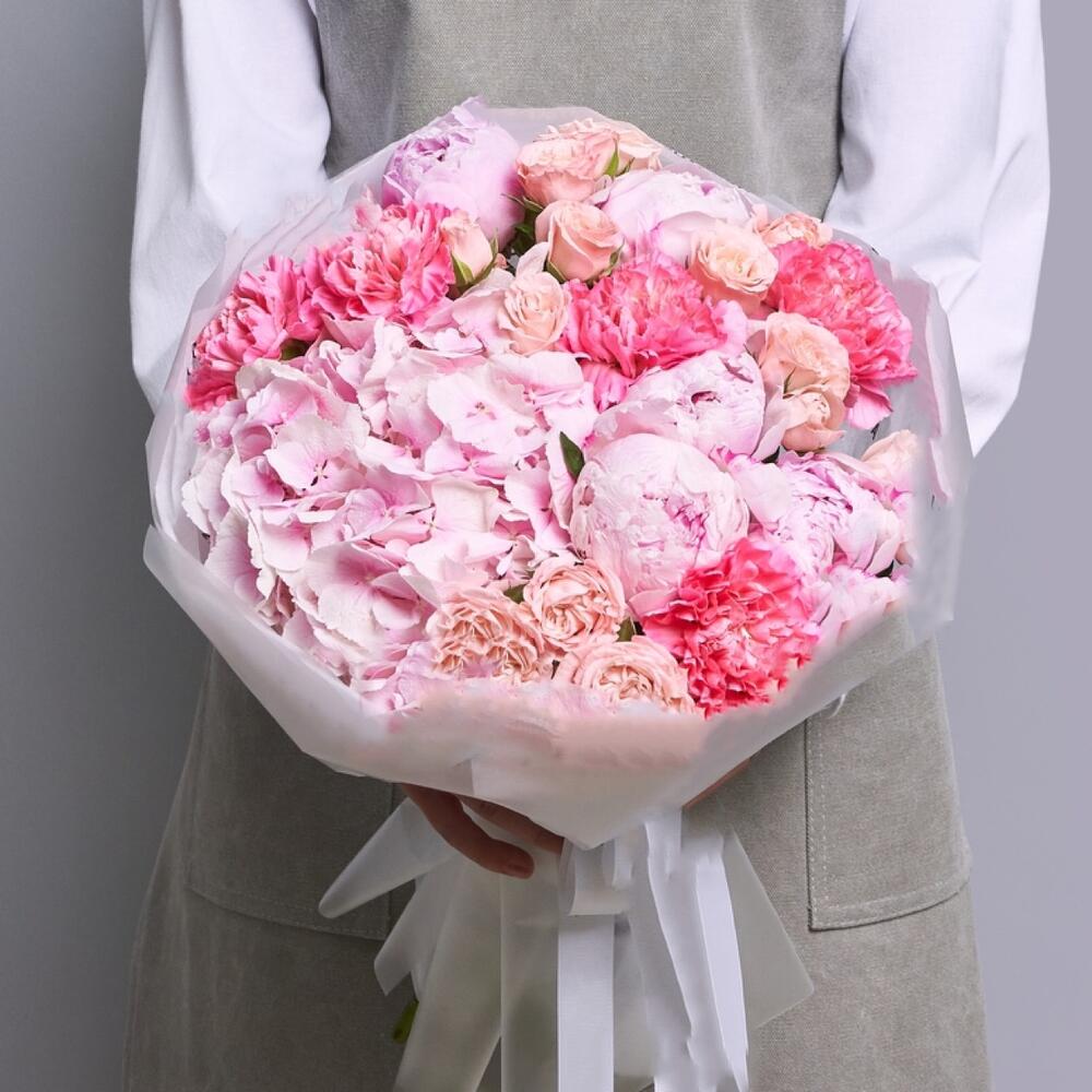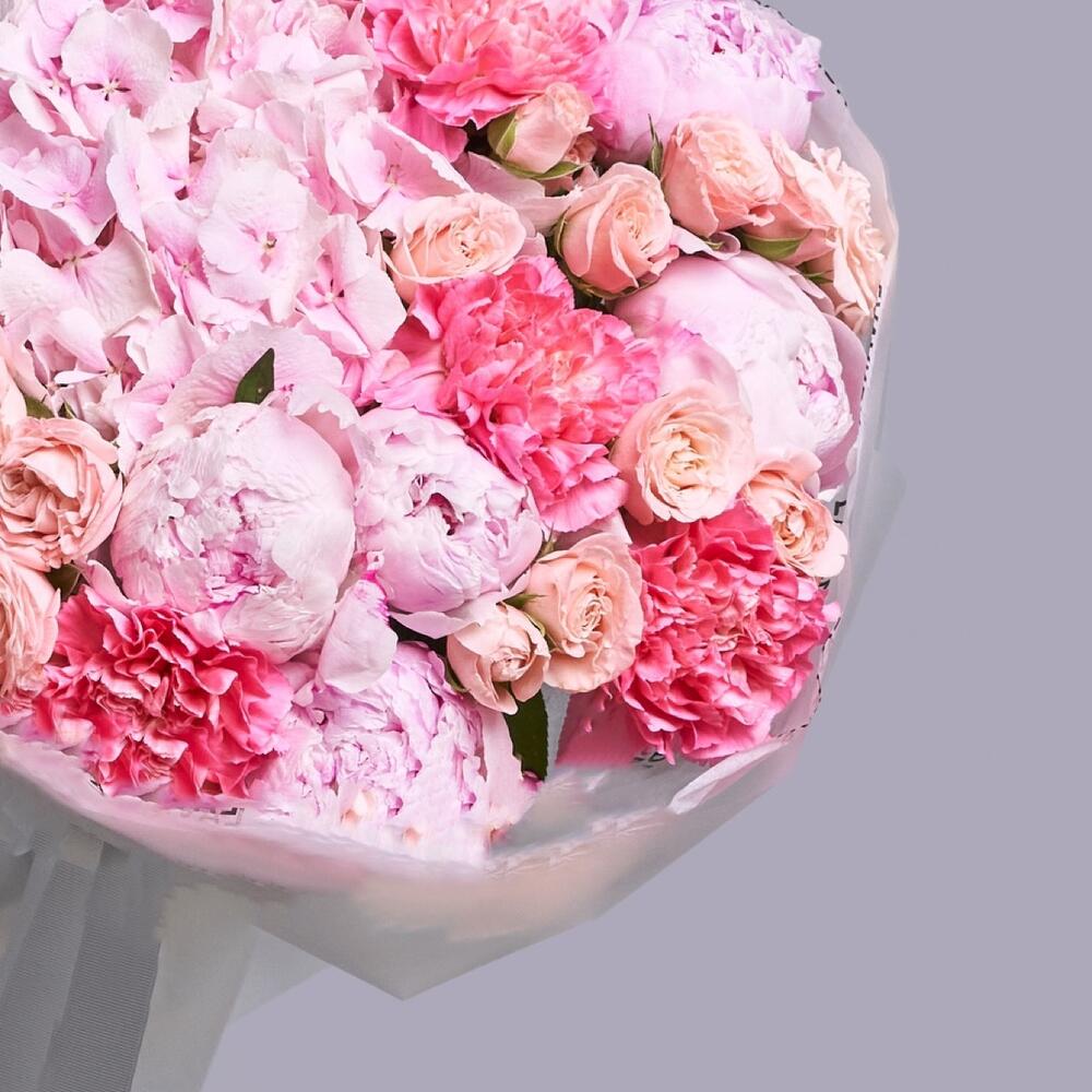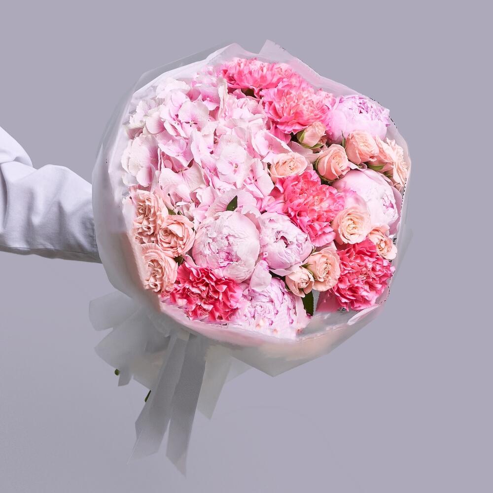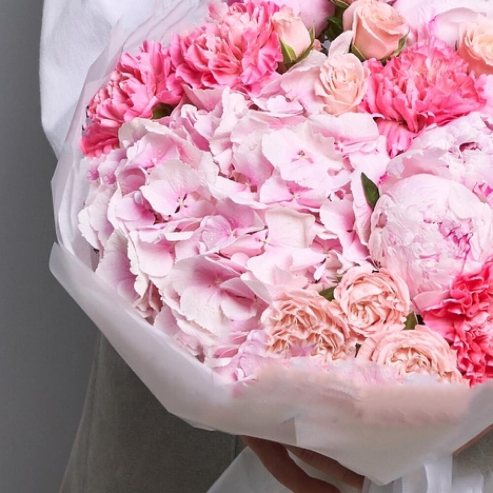- Этот нежный букет — настоящее произведение искусства природы. Розовая гортензия, словно созданная из самых нежных облаков, дарит ощущение бесконечной легкости и нежности. Розовые пионы, кустовые розы и диантусы великолепно дополняют композицию, создавая неповторимый образ.