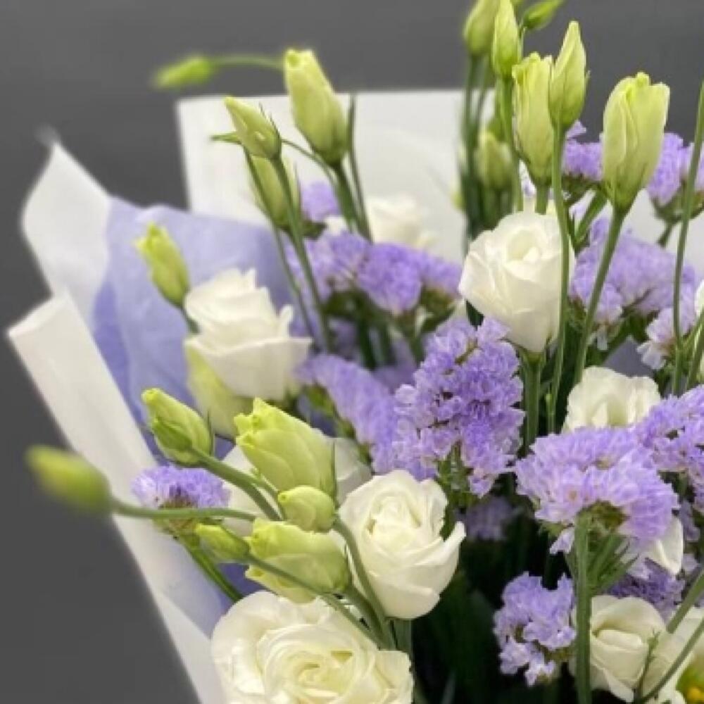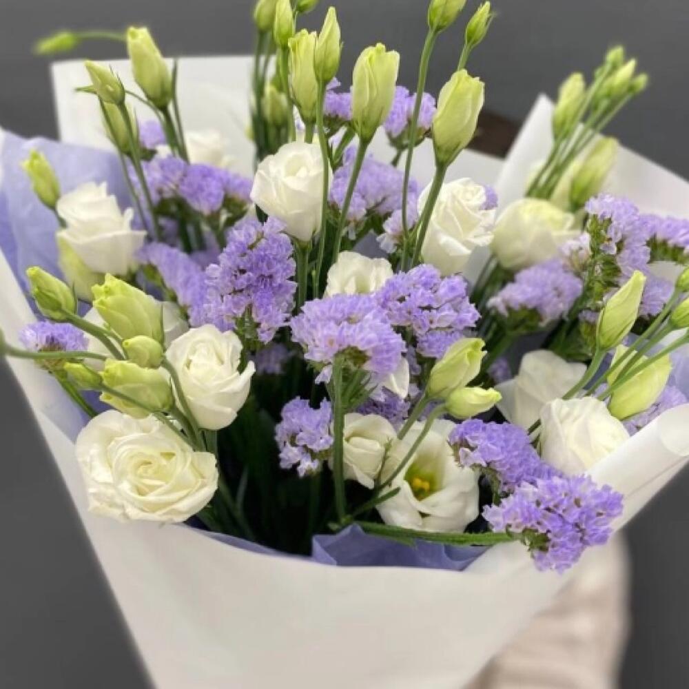 - Этот великолепный букет из трех стеблей статицы и пяти веточек эустомы создает неповторимую атмосферу изысканности и нежности. Этот букет подарит не только красоту, но и приятный аромат свежих цветов, наполняющий комнату чувством уюта и тепла.