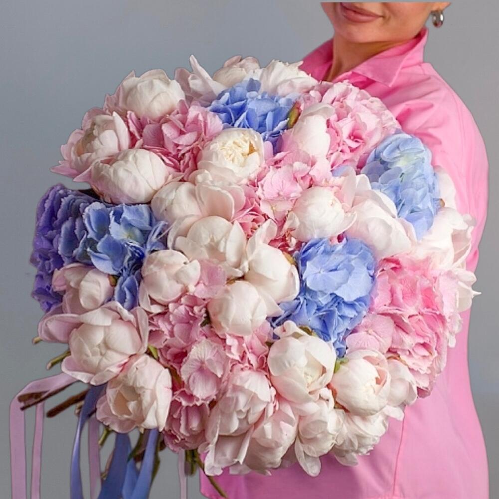 - Розовые и синие гортензии сопровождаются прекрасными пионами, добавляющими еще больше красоты и роскоши этому букету.