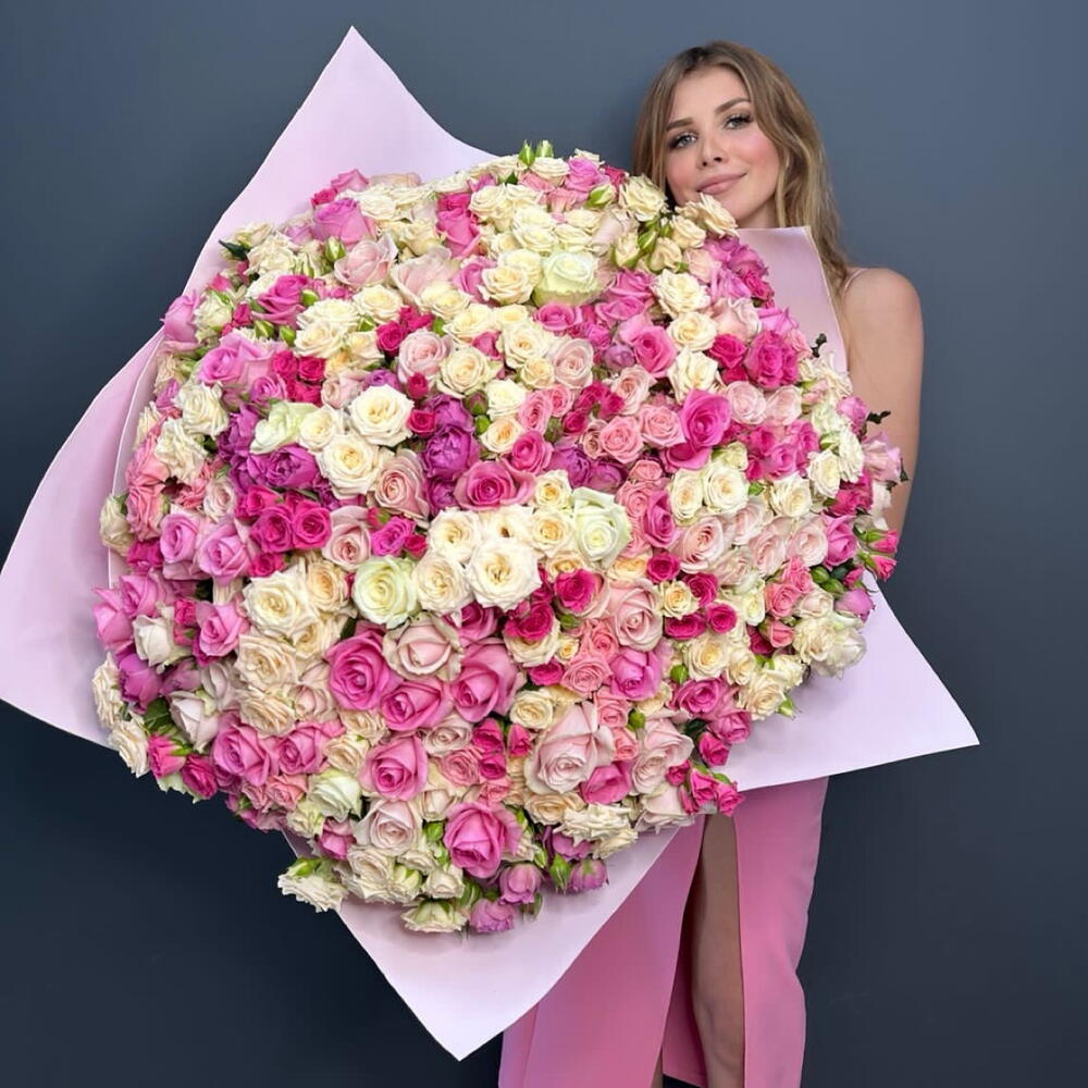 - В нем собрано 181 изысканных цветов, которые создают неповторимую композицию из нежных оттенков розового цвета.