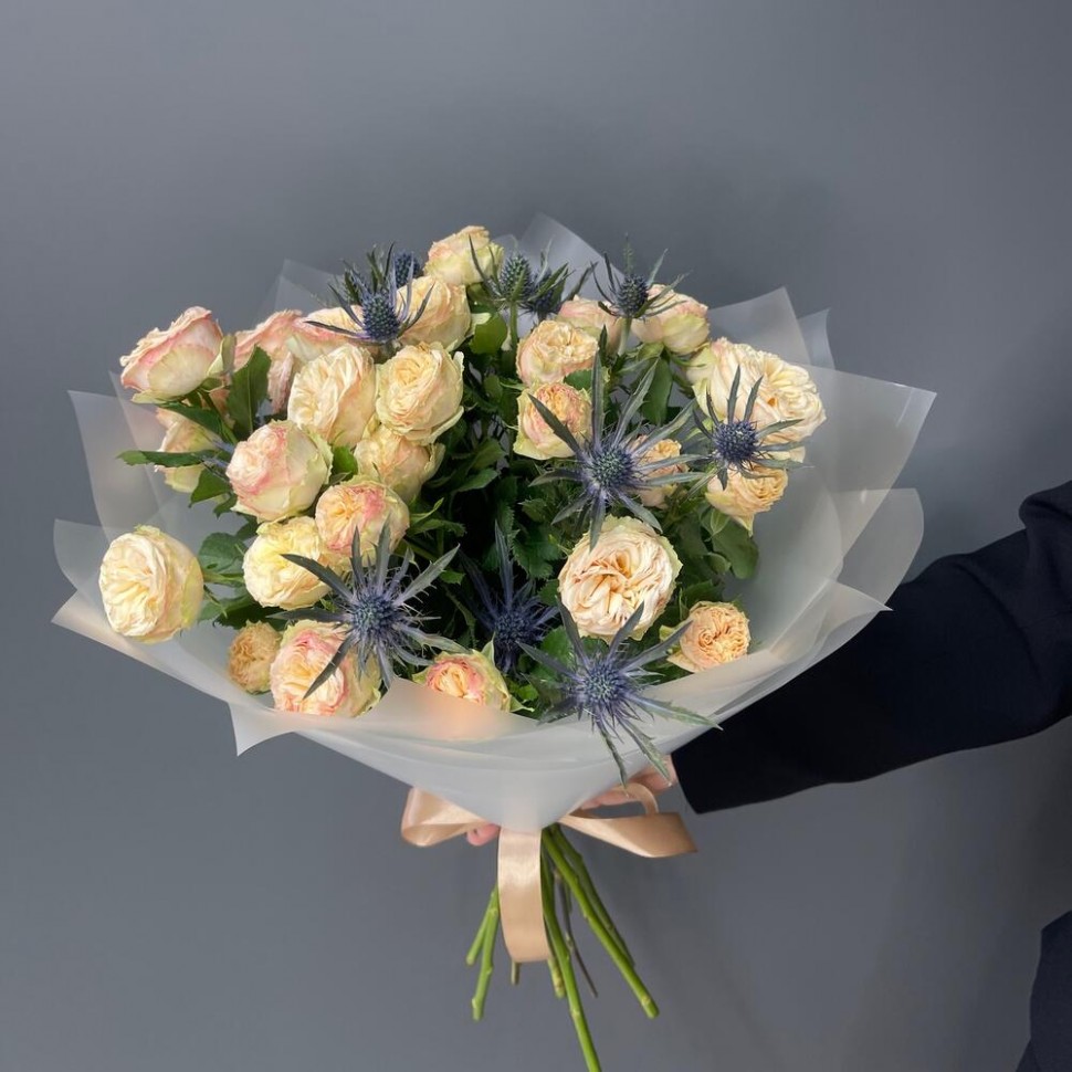 Gentle trendsetter роза пионовидная — 7 шт Эрингиум синий — 3 шт