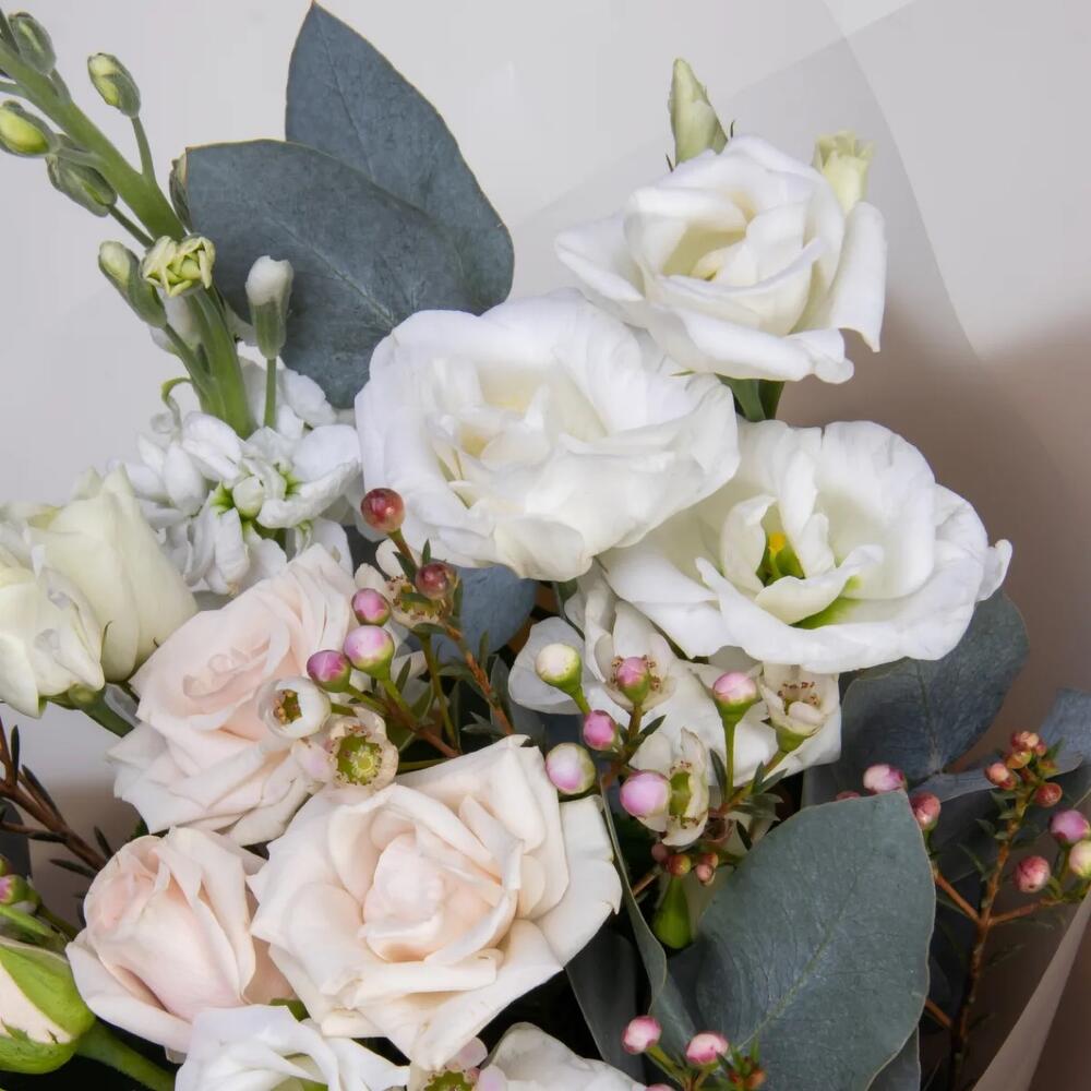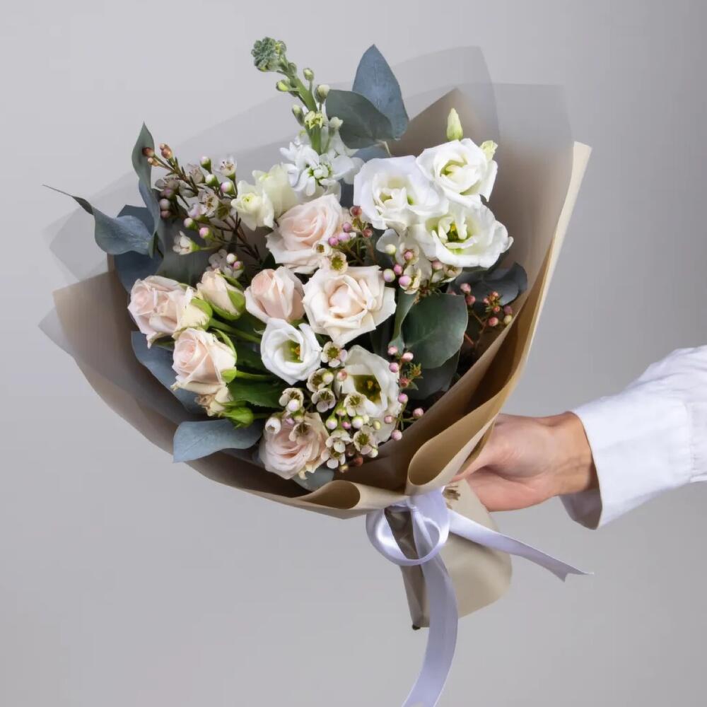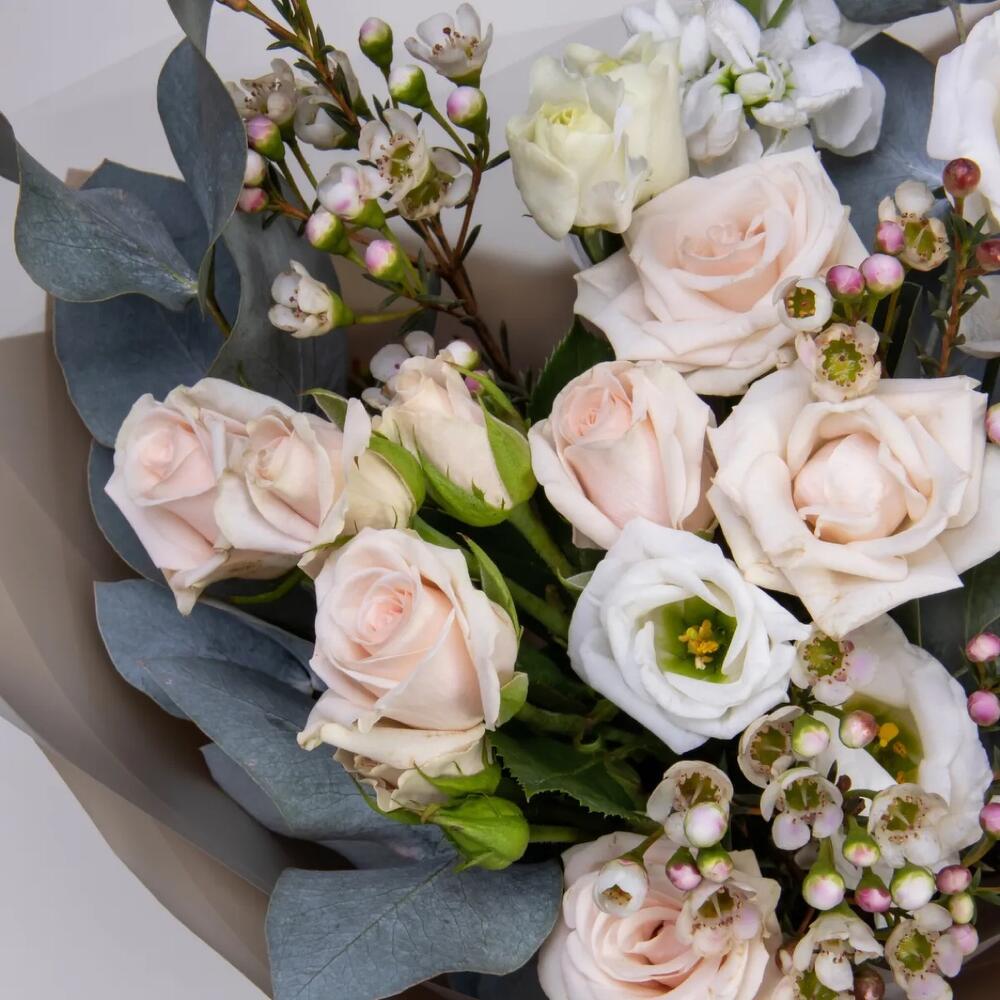 Кустовая роза — 3 шт Хамелациум — 2 шт Эустома — 2 шт Маттиола — 1 шт Эвкалипт Baby Blue — 3 шт