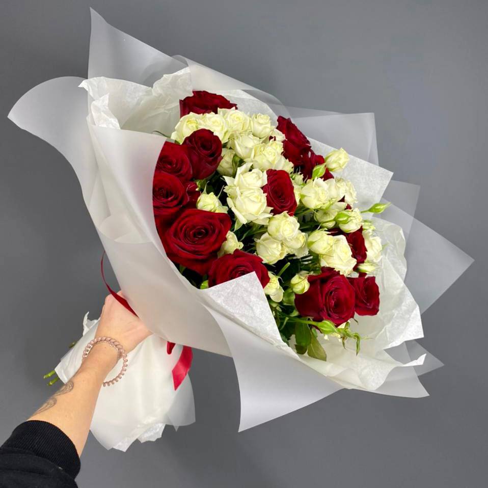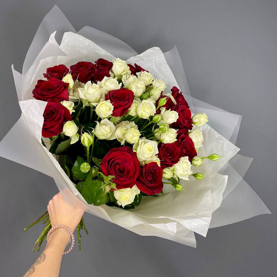 Большой букет из красных одноголовых роз и белых кустовых роз в бумаге эколюкс и матовой прозрачной бумаге – это не только красивый и элегантный подарок, но и способ выразить свои чувства и показать, как важны для вас люди, которых вы любите. Сделайте этот букет частью своей жизни и он станет символом вашей нежности и романтики