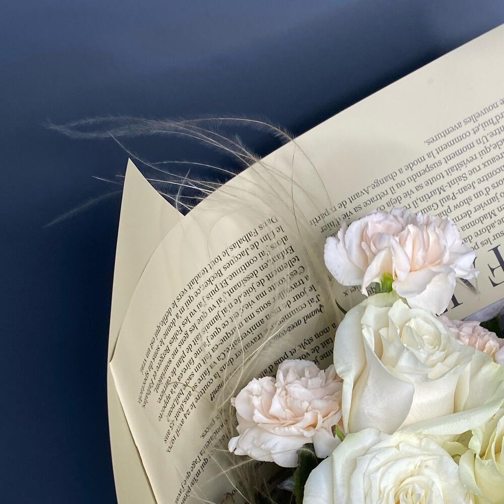 - Нежный букет из гвоздики и белой розы в модной упаковке — настоящая воплощение элегантности и изысканности.