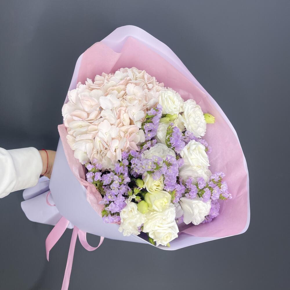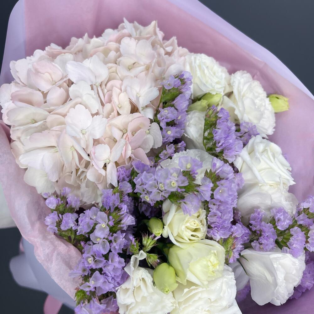 Гортензия — 1 шт Эустома — 3 шт Статица синяя — 2 шт Дизайнерская упаковка — 2 шт