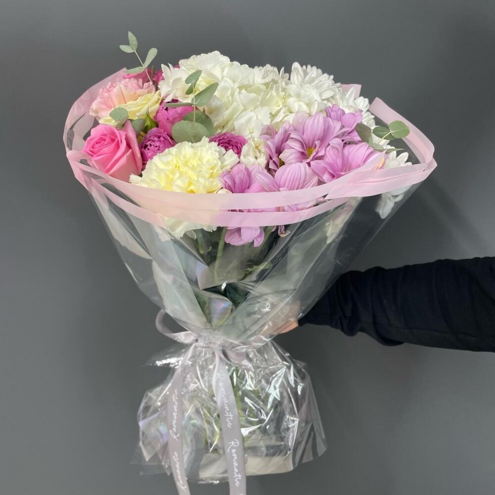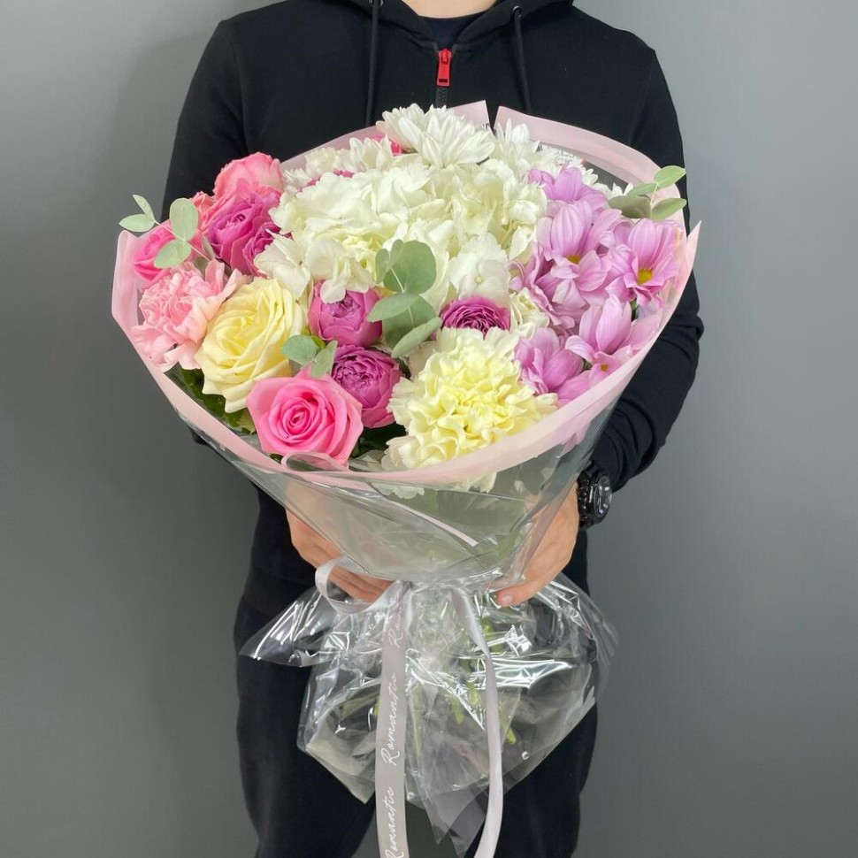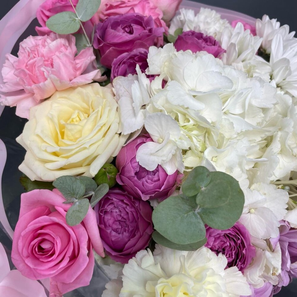 - Розы Россия — символ любви и страсти, гортензия — знак благородства и изобилия, гвоздика — символ душевной близости и тепла, хризантема кустовая — символ радости и душевного комфорта. А эвкалипт Baby Blue добавляет этому букету особую изысканность и шарм.