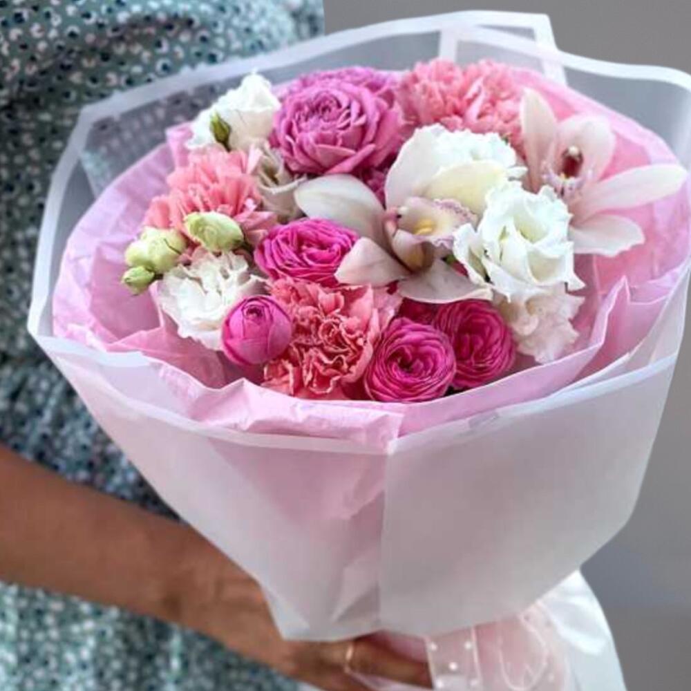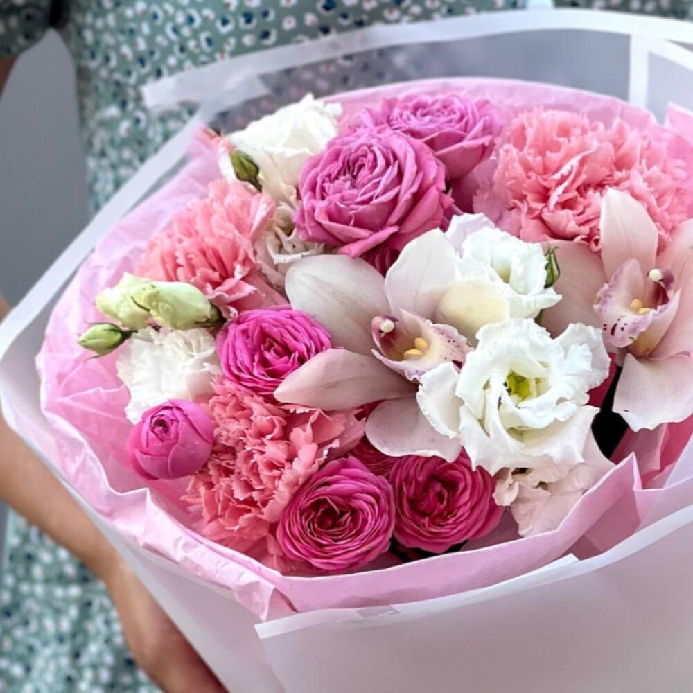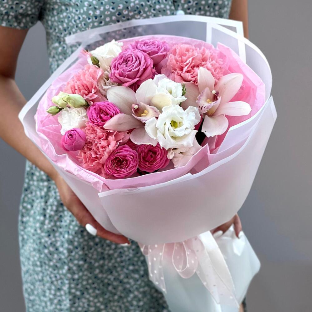 Орхидея Цимбидиум — 2 шт Misty bubbles — 3 шт Эустома белая — 3 шт Диантус — 3 шт