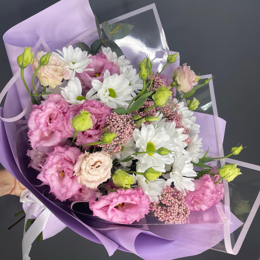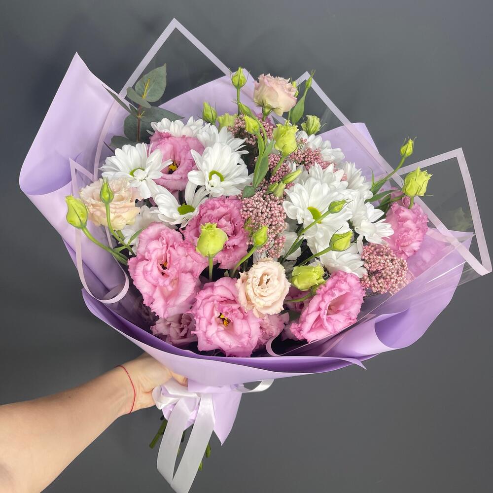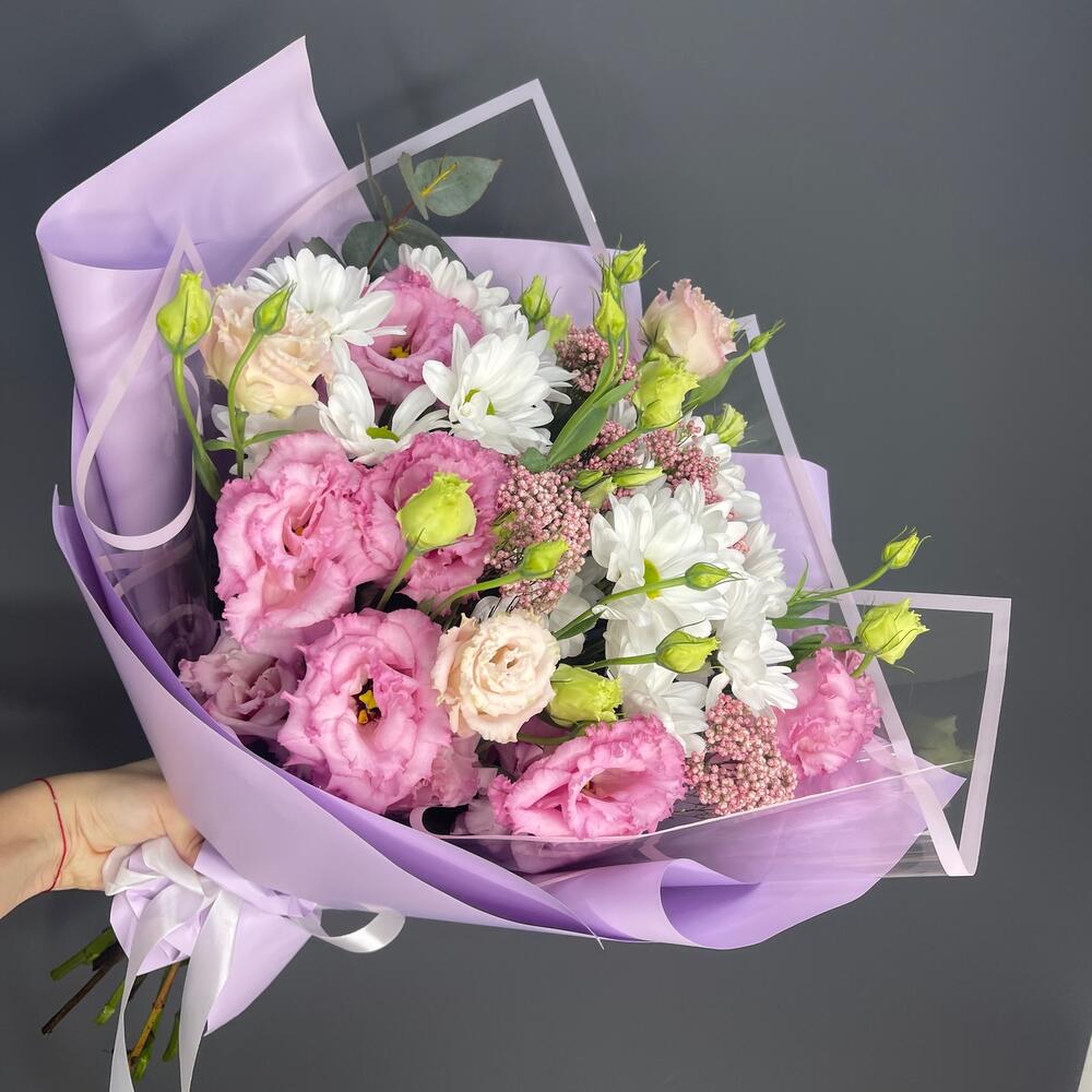 Эустома — 5 шт Озотамнус — 5 шт Эвкалипт — 3 шт Хризантема кустовая — 3 шт