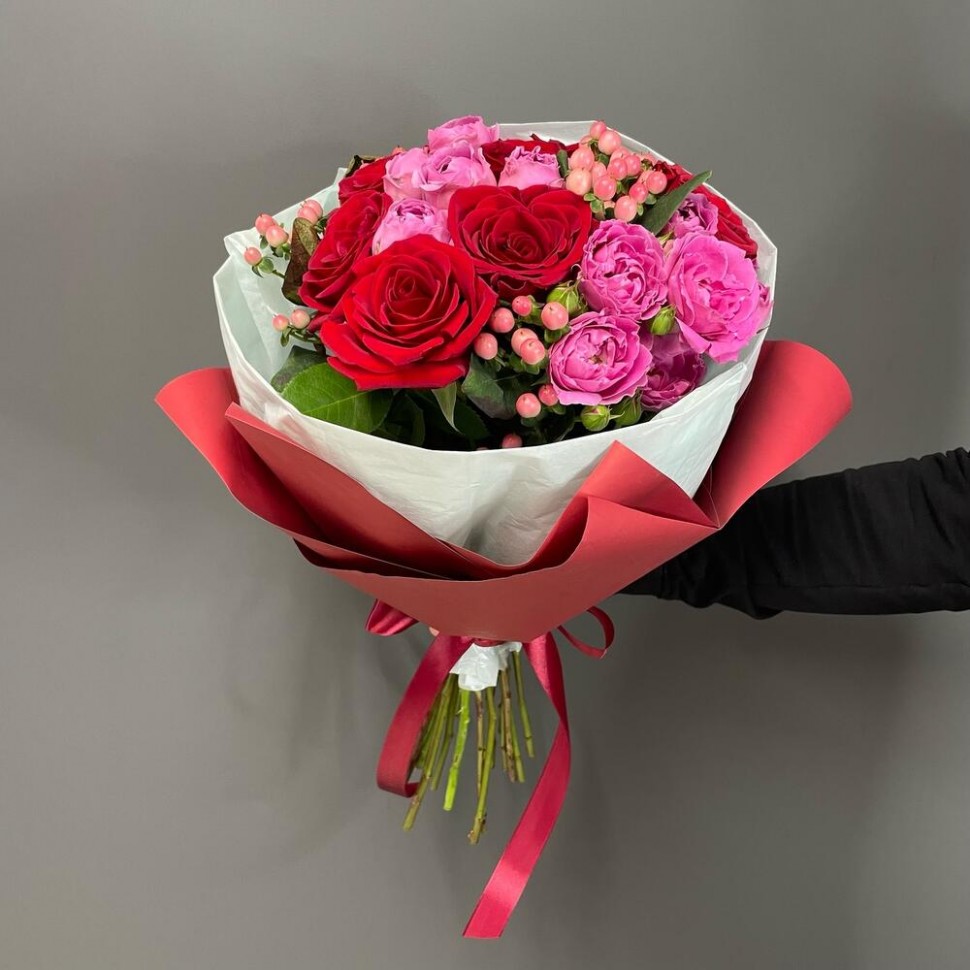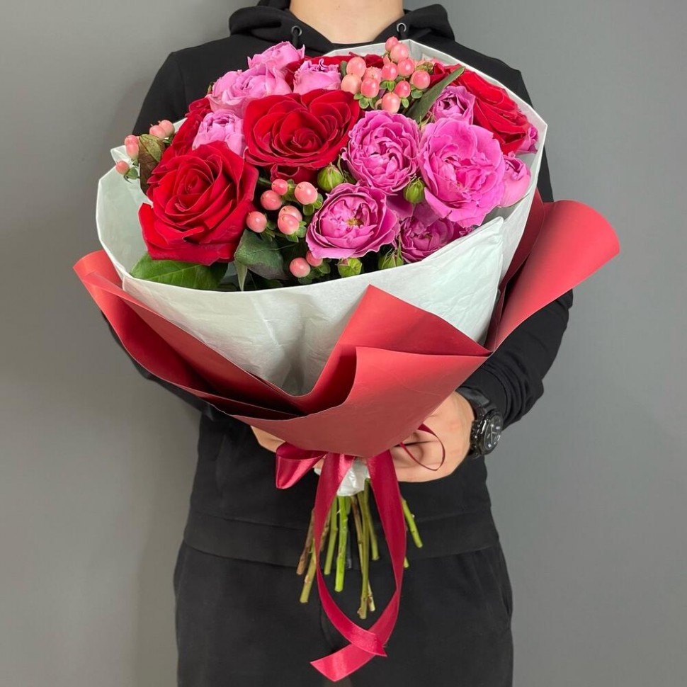 Эквадор Роза — 7 шт Кустовая Пионовидная роза — 3 шт Гиперикум — 5 шт Упаковка дизайнерская — 1 шт
