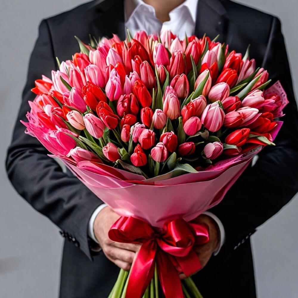Букет из 101 нежно розовых тюльпанов и красных — это идеальный способ выразить свою любовь и нежность. Подарите этот великолепный букет своей половинке