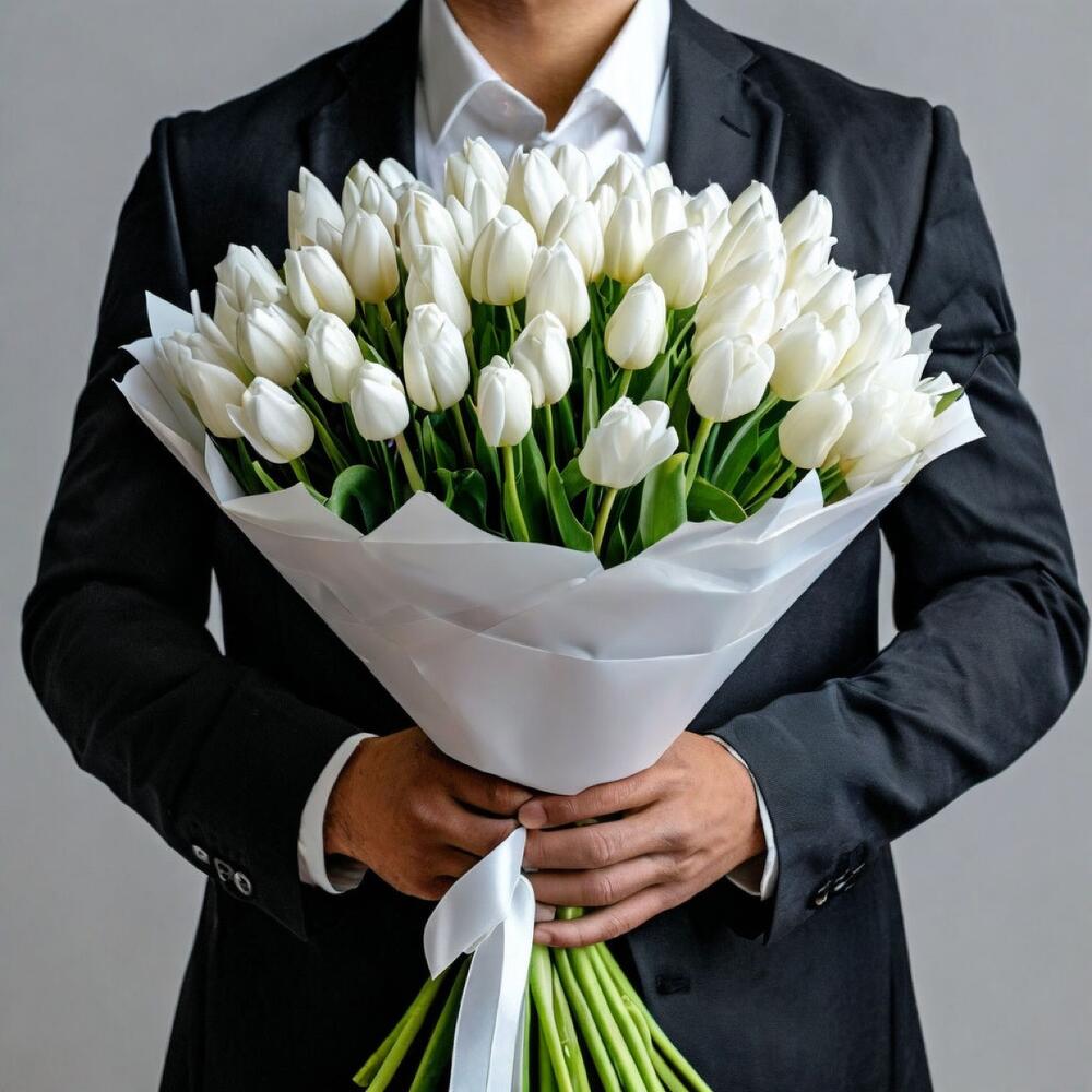 - Букет из 101 белого тюльпана — это изысканный и элегантный подарок, который символизирует чистоту, нежность и искренность чувств.