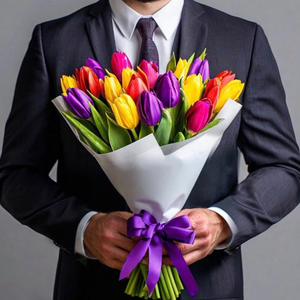 Благодаря своей нежной красоте и изысканности, 25 разноцветных тюльпанов станут прекрасным подарком для любого случая: от дня рождения до юбилея.
