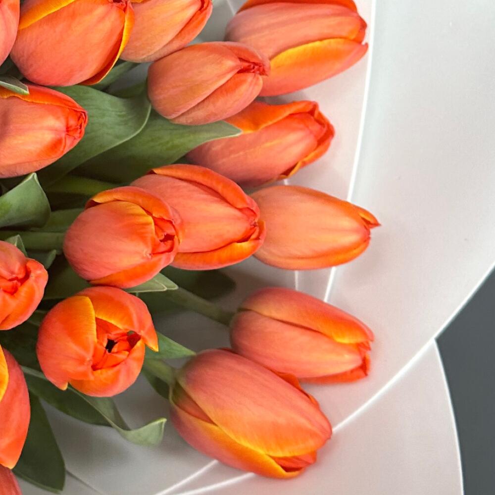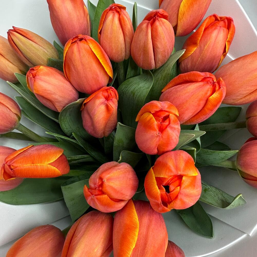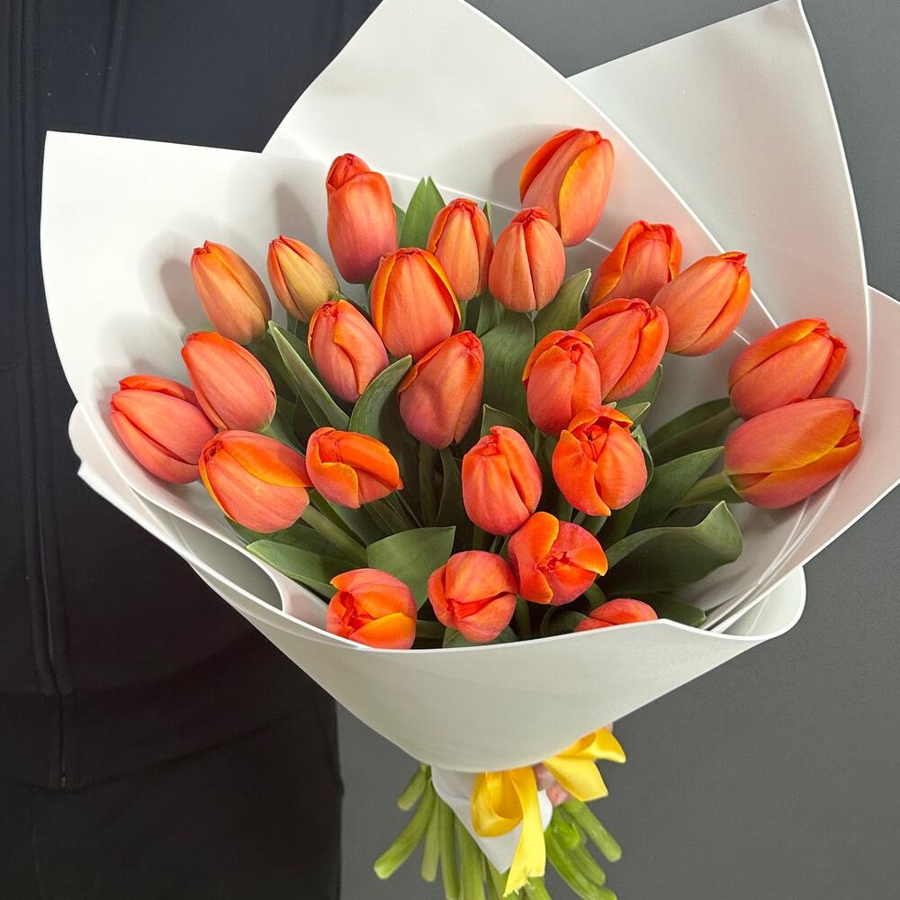 Букет из 25 оранжевых тюльпанов — это яркое и стильное сочетание цветов, которое символизирует страсть, энергию и радость. Красные тюльпаны олицетворяют любовь, страсть и силу чувств, в то время как желтые тюльпаны добавляют нотку солнечного света, радости и оптимизма.