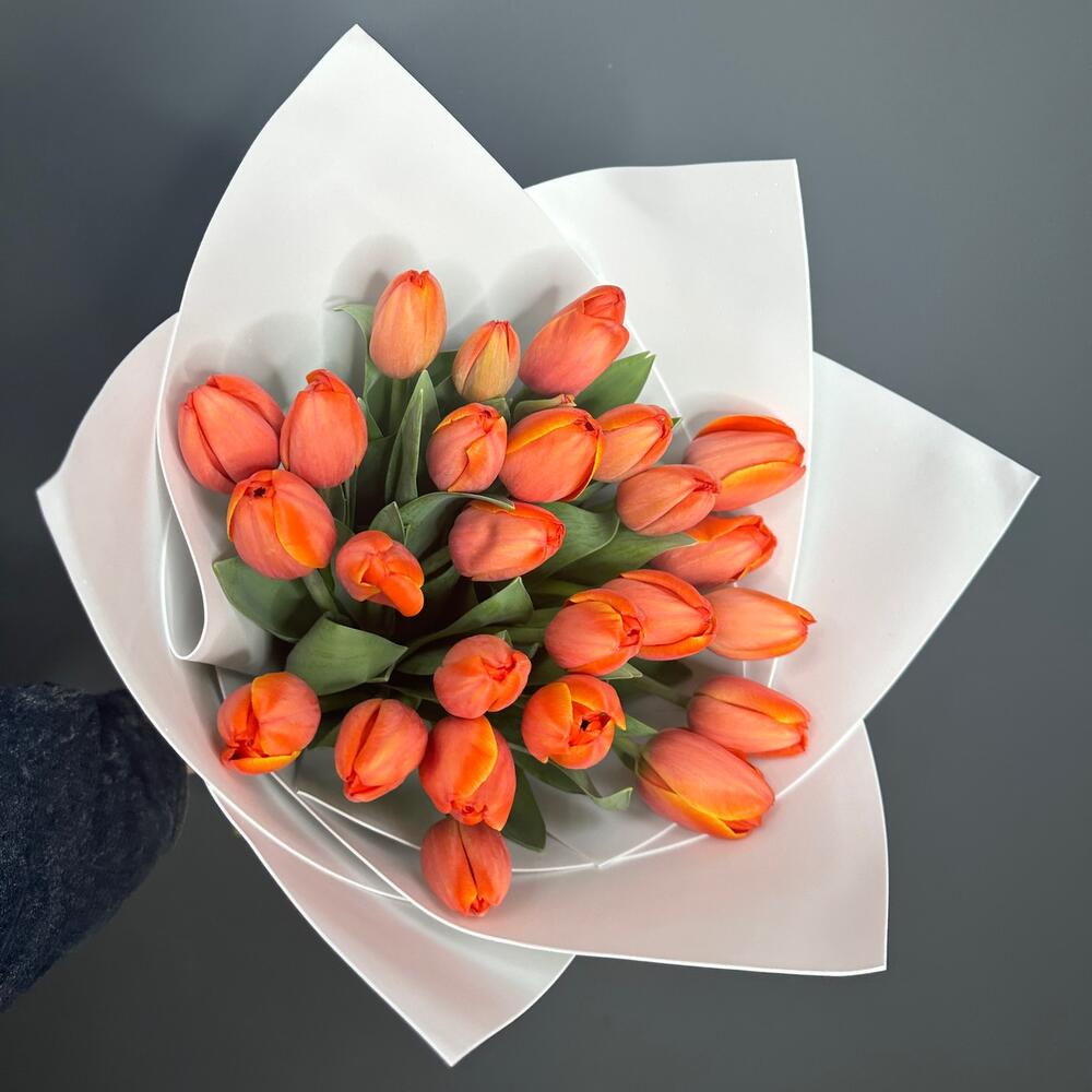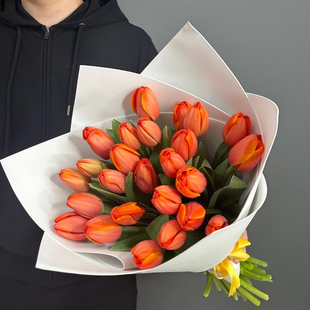 Яркая упаковка подчеркнет интенсивность и красоту цветов, придавая им особый шарм и привлекательность. Букет из 25 оранжевых тюльпанов станет замечательным подарком для любого повода — от дня рождения до простого желания порадовать близких.