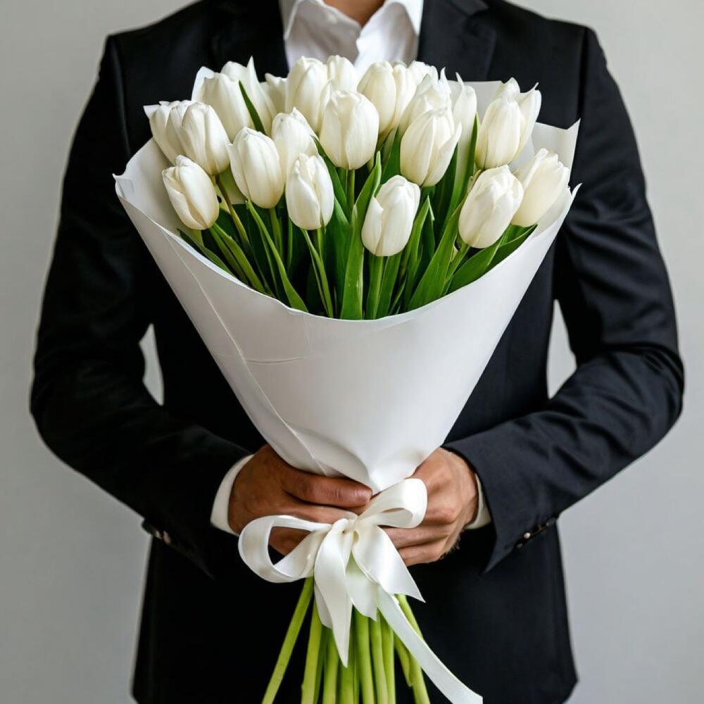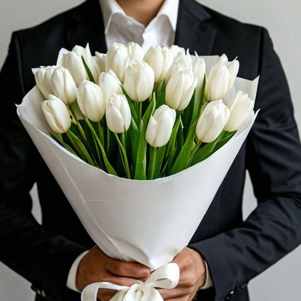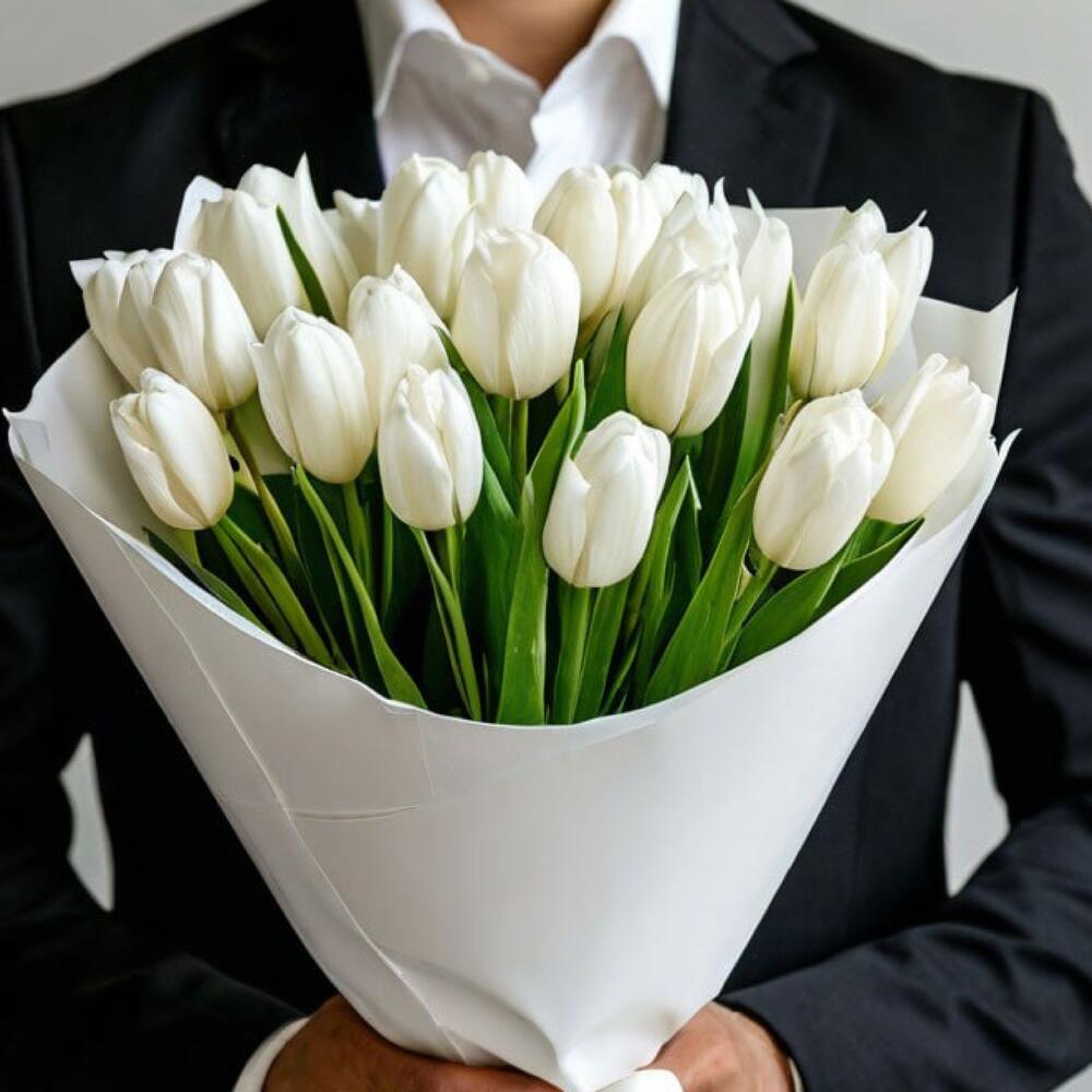 - Дизайнерская упаковка в белых тонах придает этому букету особую изысканность и стиль. Белые тюльпаны на фоне белой упаковки создают элегантный и благородный образ, который подчеркивает изысканность и утонченность цветов. 25 белых тюльпанов в белой дизайнерской упаковке подойдут как для свадебного торжества, так и для романтического вечера или просто чтобы выразить нежные чувства и заботу.