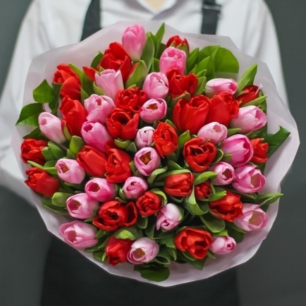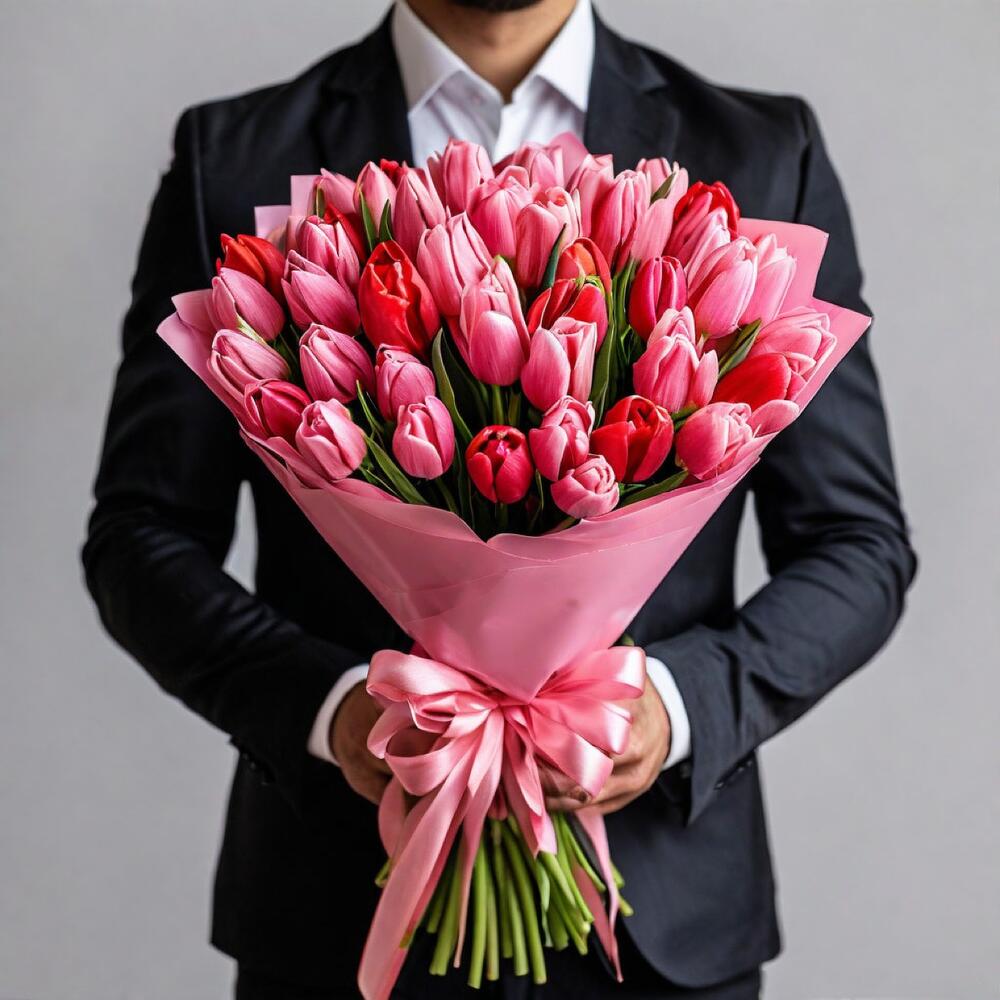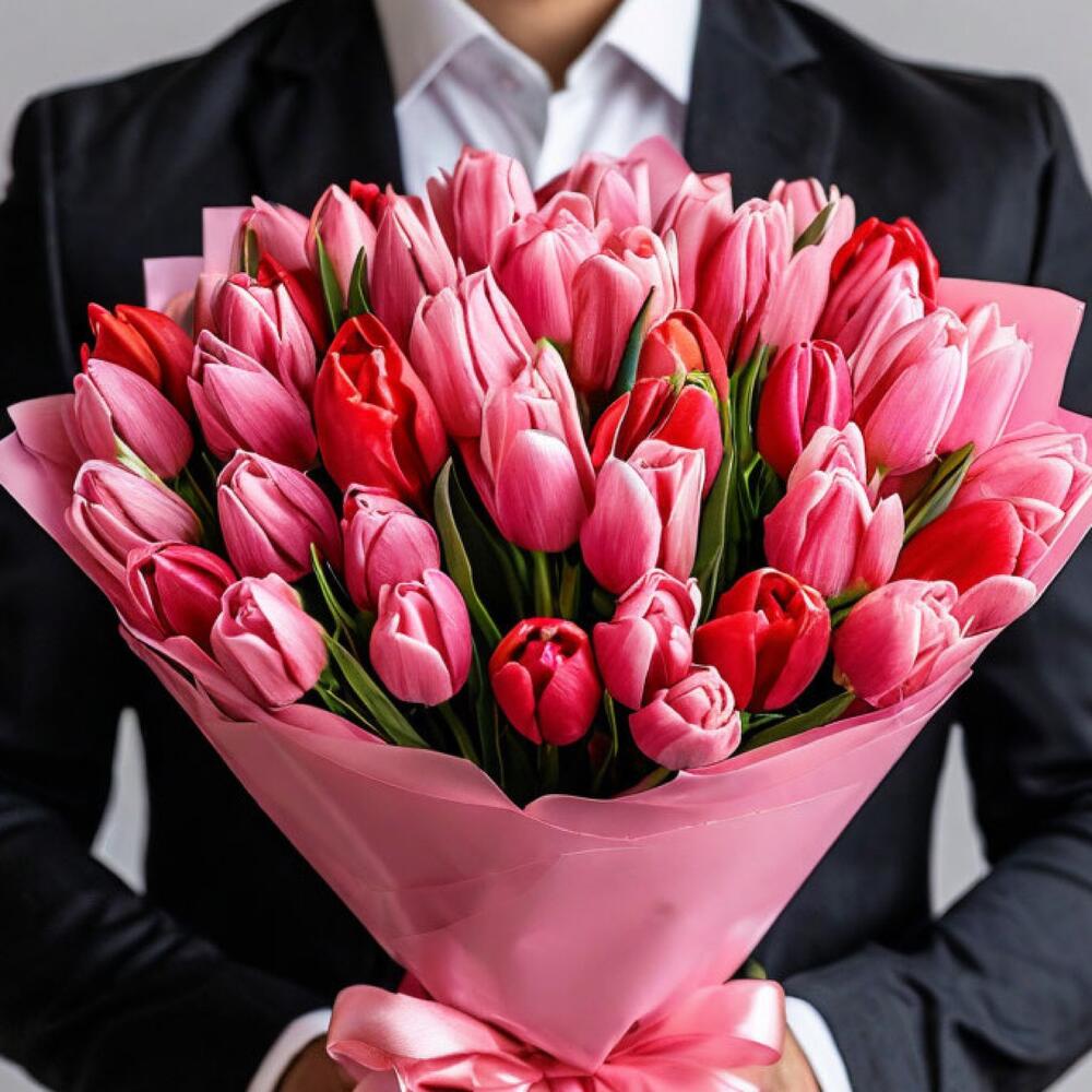 Букет из 51 розового и красного тюльпана в розовой упаковке — это нежный и романтичный подарок, который символизирует любовь, нежность и уважение.