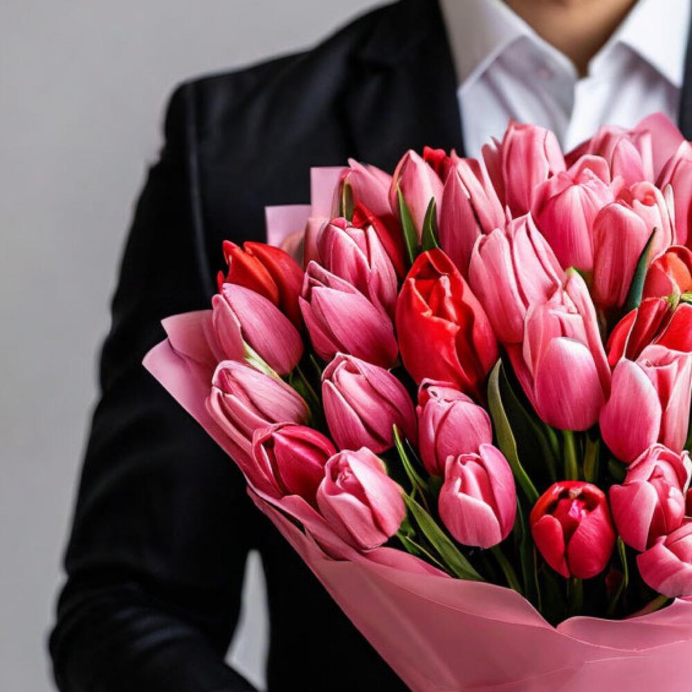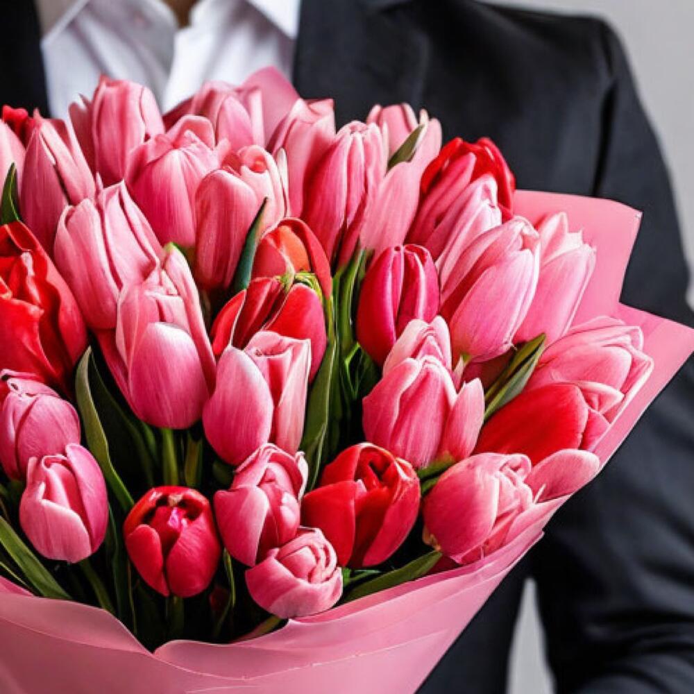 Розовые тюльпаны обычно ассоциируются с нежными чувствами, восхищением и признанием в любви, а красные тюльпаны добавляют яркости и страсти этому букету. Розовая упаковка придает букету изысканности и женственности, подчеркивая красоту цветов и создавая впечатление нежности. Этот букет станет прекрасным подарком для любого романтического события, такого как День Святого Валентина, годовщина свадьбы или просто для того, чтобы выразить свою нежность и заботу о близком человеке.