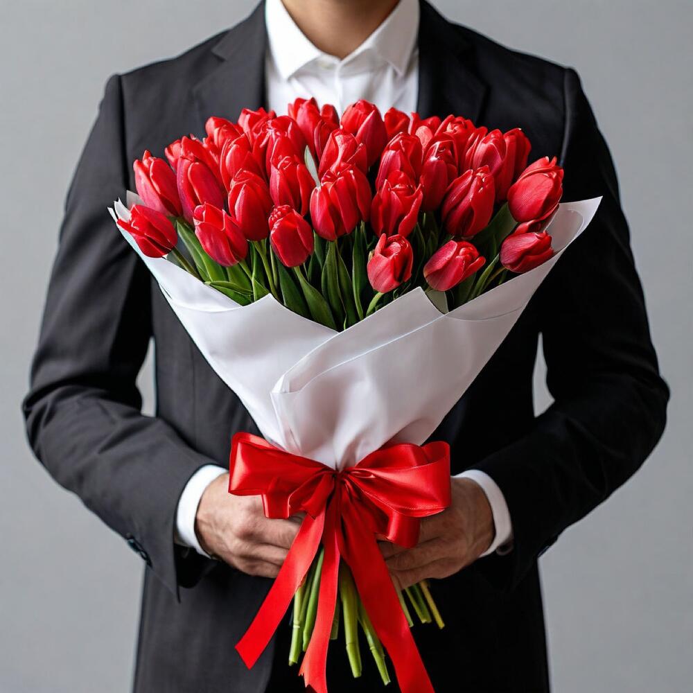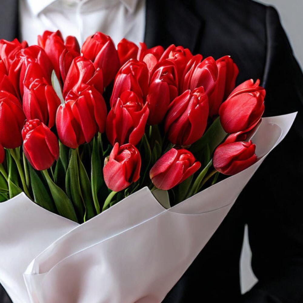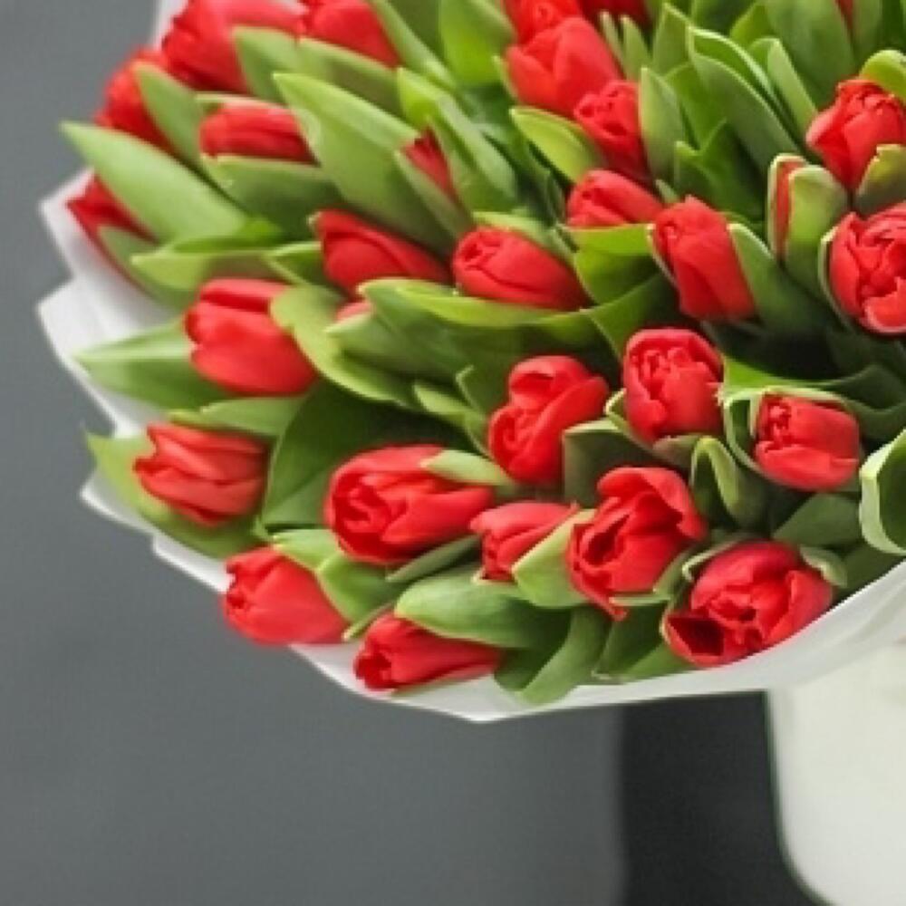 Букет из 51 красного тюльпана в белой упаковке — это страстный и яркий подарок, который символизирует глубокие чувства и стойкую любовь.