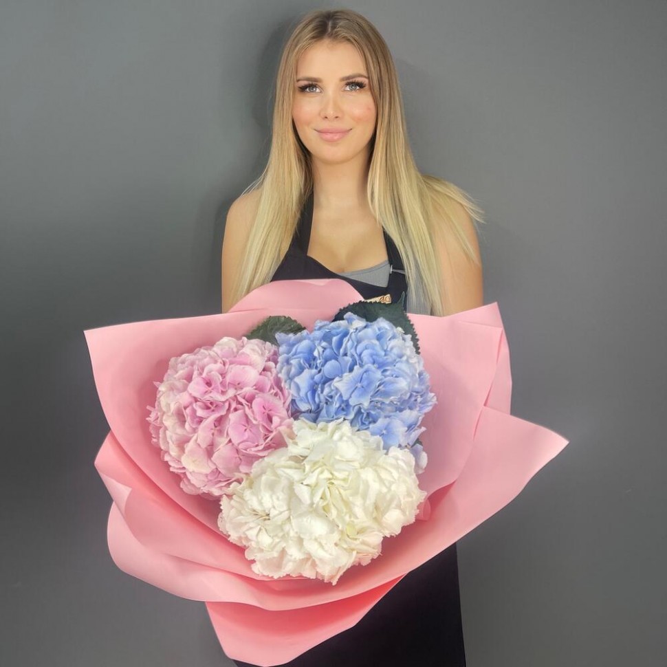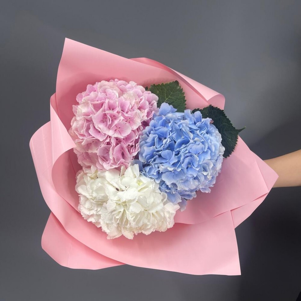 • Этот великолепный букет из пяти кустовых гортензий в розовой упаковке — настоящее произведение искусства.