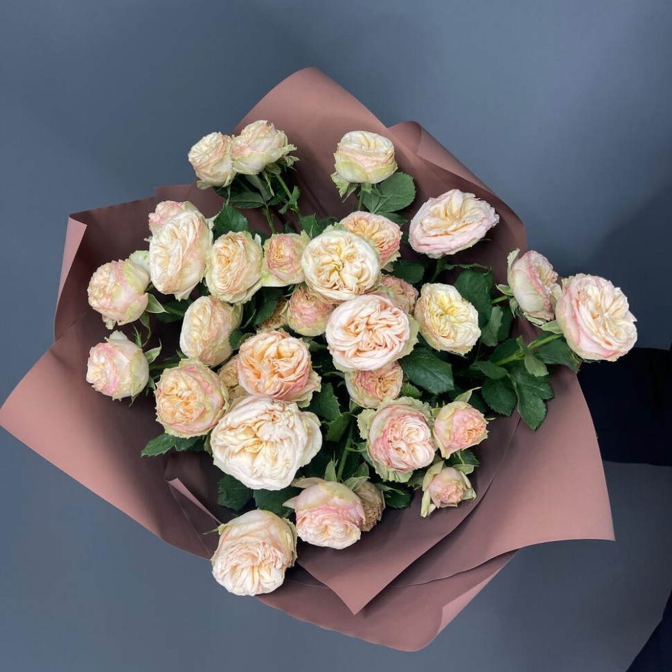Роза пионовидная кустовая кремовая в коричневой упаковке — это букет, который никого не оставит равнодушным и запомнится на долгие годы