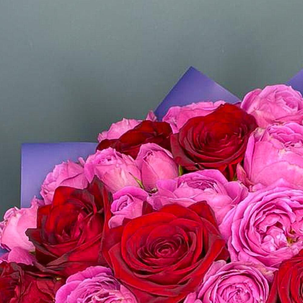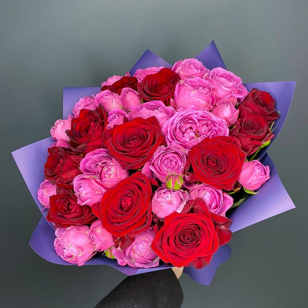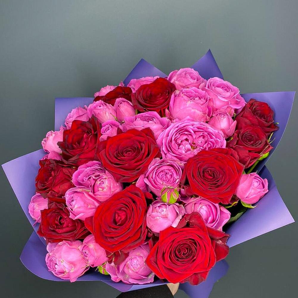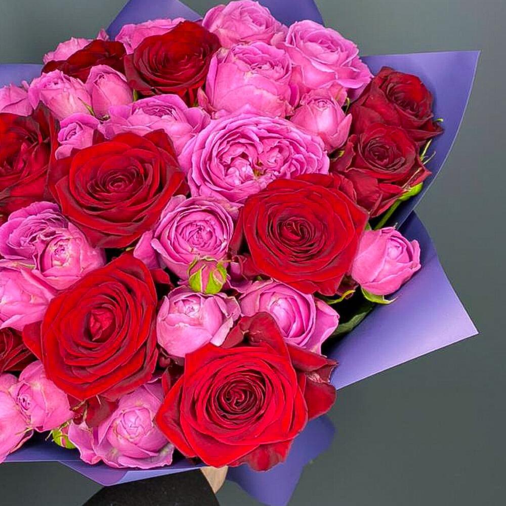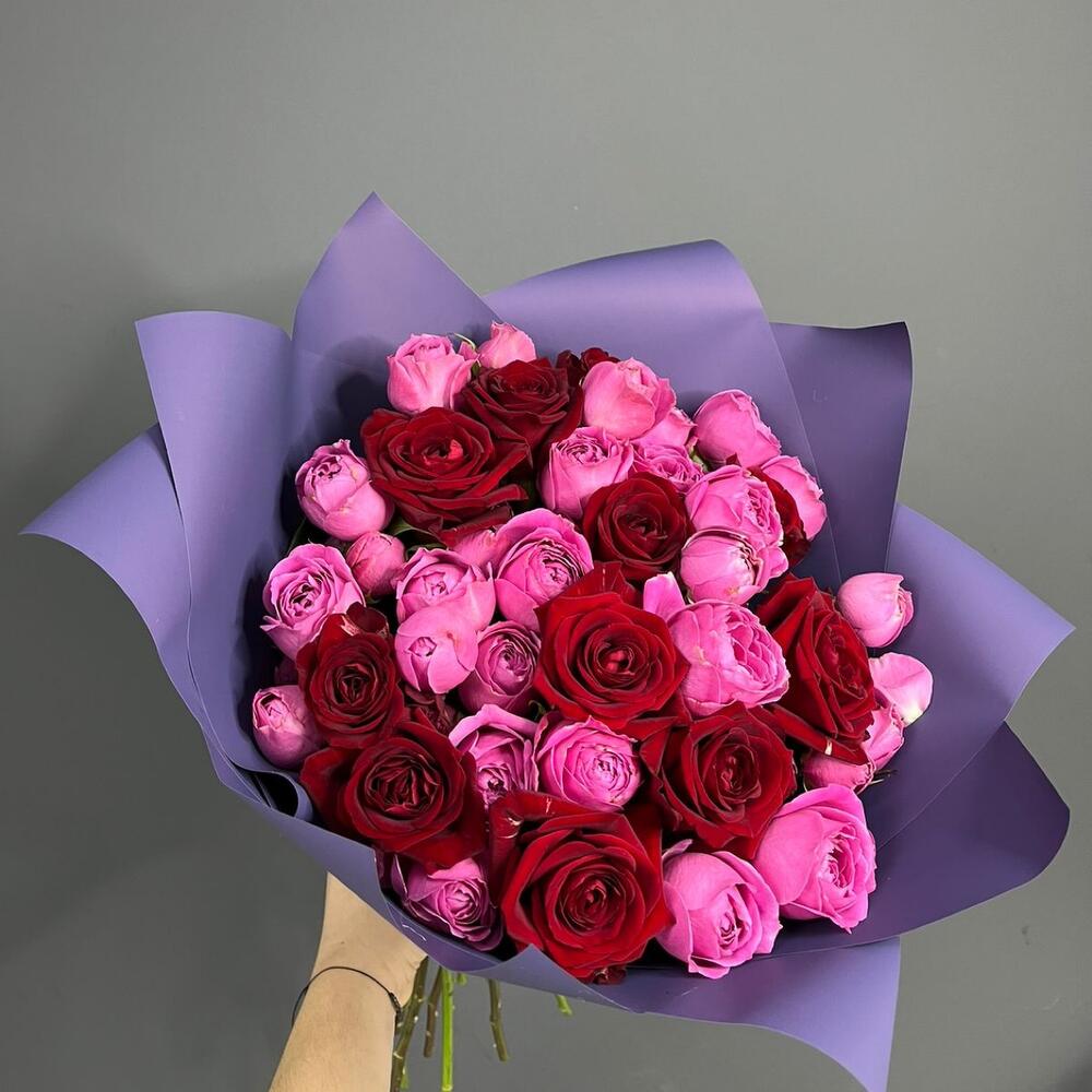 - Розовый цвет кустовой розы символизирует чистоту и нежность чувств, а матовая сиреневая упаковка придает ему загадочности и таинственности.
