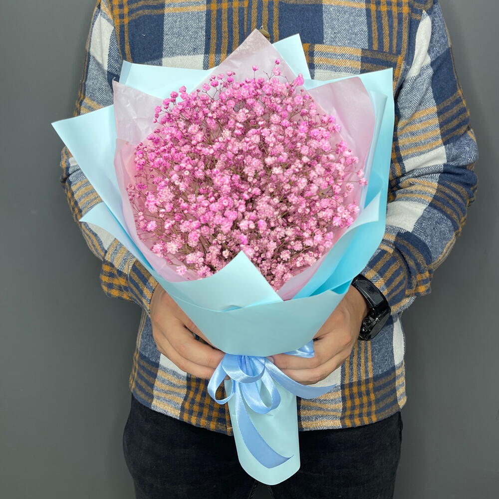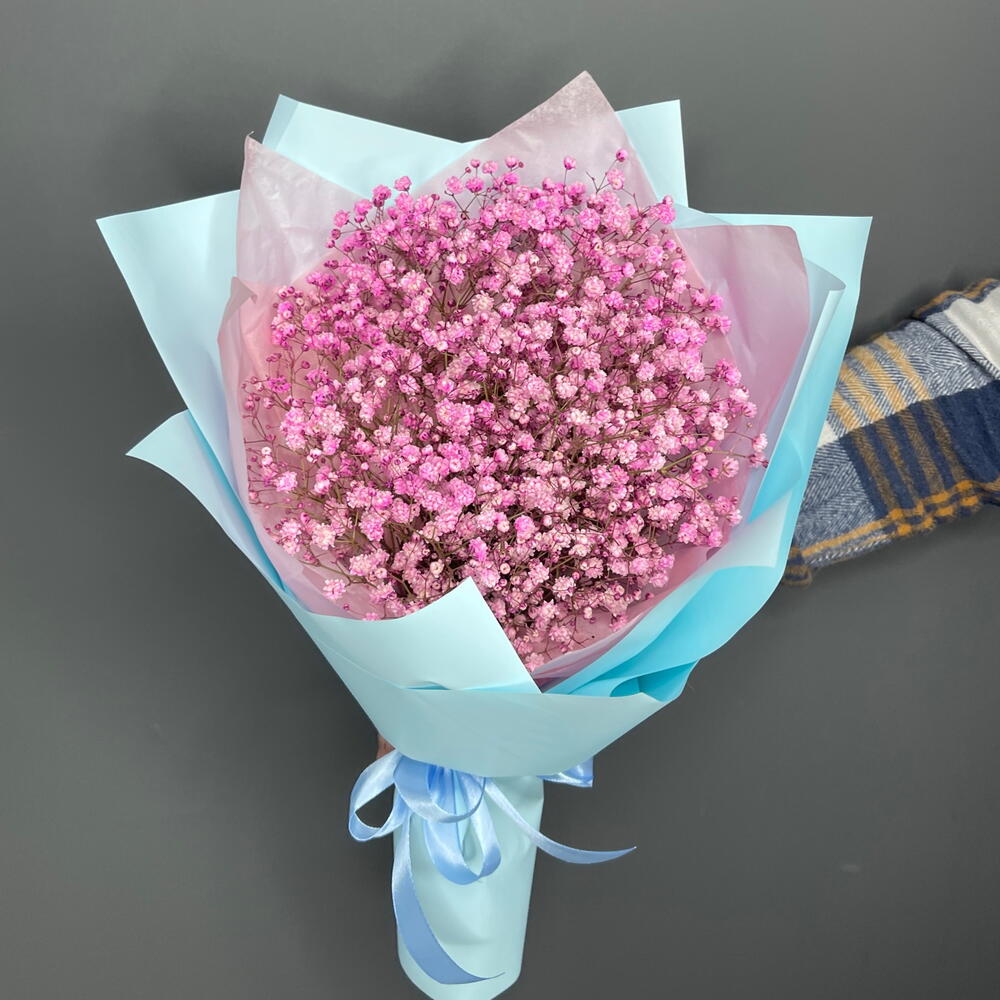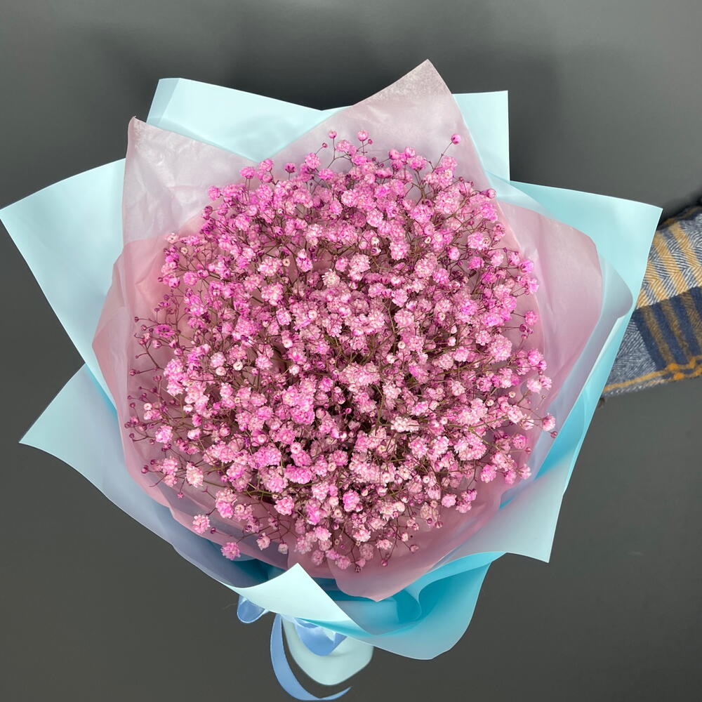 - Изящный букет из трех кустов гипсофилы розового цвета в голубой упаковке – настоящий символ нежности и чистоты.