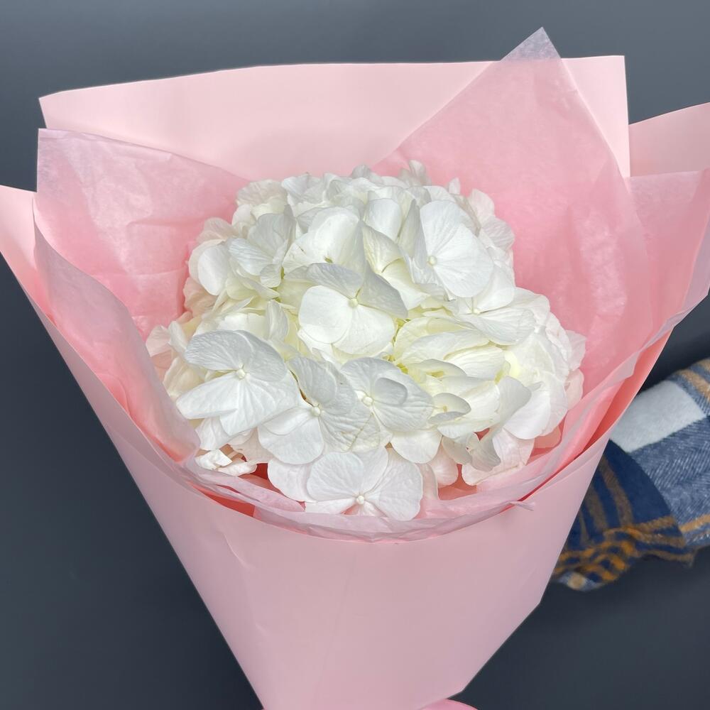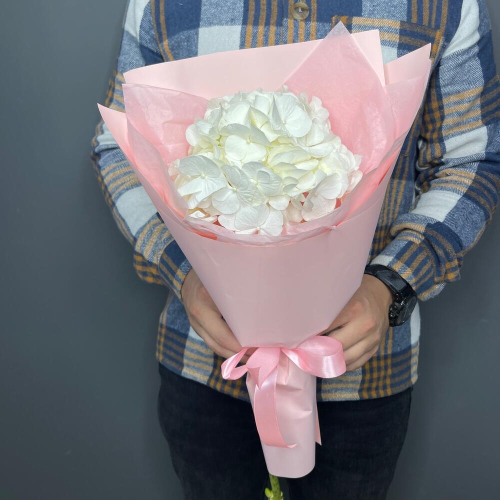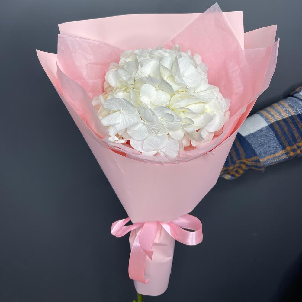 • Этот изумительный букет из одной белой гортензии в нежно розовой упаковке – это настоящее произведение цветочного искусства. Белый цвет гортензии символизирует чистоту, нежность и бесконечную любовь, а нежно розовая упаковка придает ему изысканность и женственность.