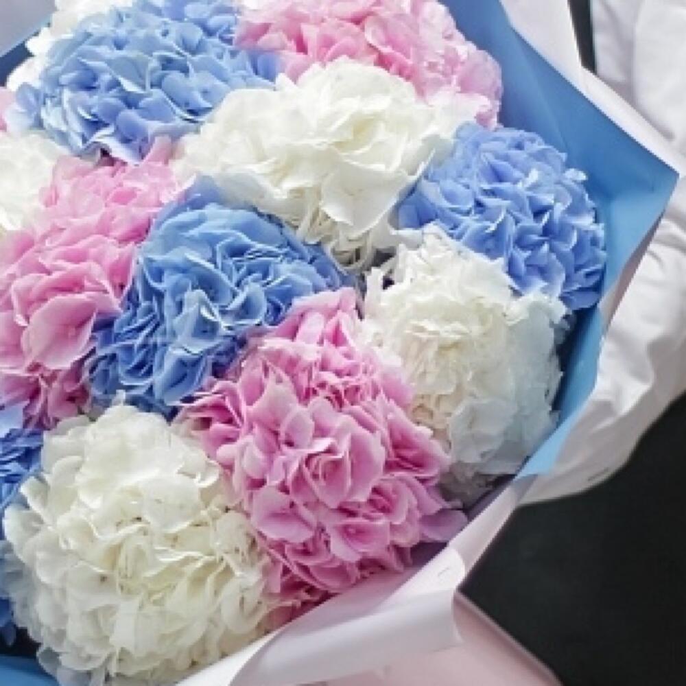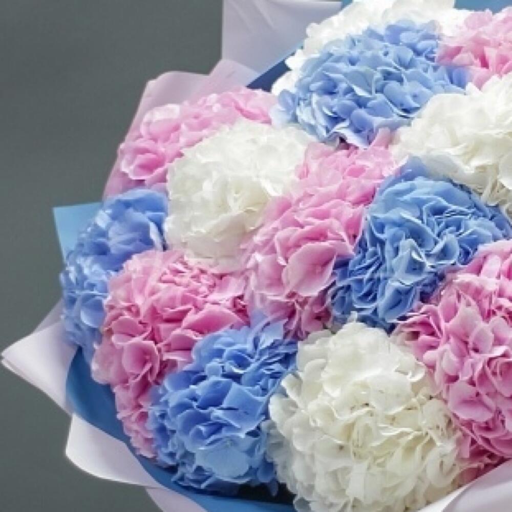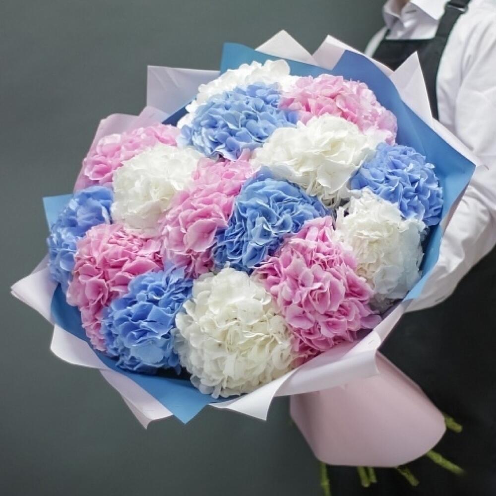 - Этот букет из 15 гортензий в нежных оттенках розового, белого и синего цветов олицетворяет красоту, нежность и чистоту. Благодаря своей изысканности и элегантности, этот букет создаст атмосферу магии и романтики в любом празднике или особом случае.