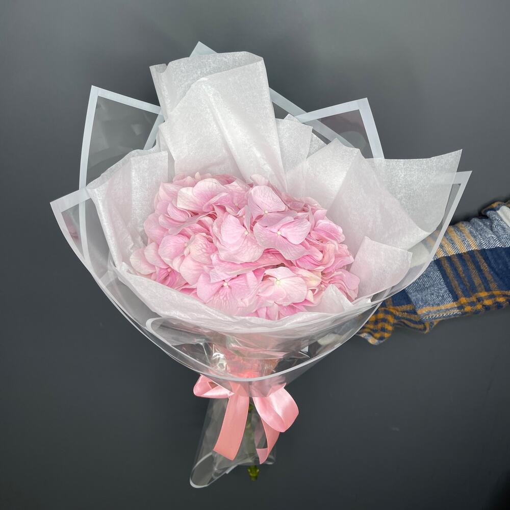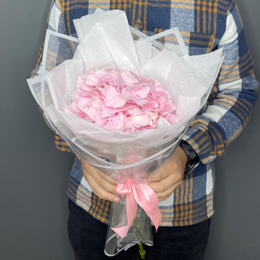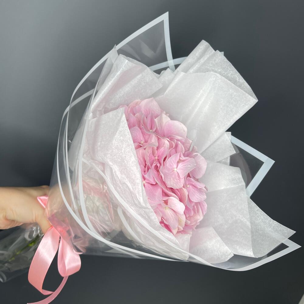 - Прекрасный букет из одной розовой гортензии в прозрачной упаковке с белыми углами и белой упаковке – это настоящее произведение искусства. Яркий цвет гортензии символизирует любовь, нежность и романтику, а прозрачная упаковка позволяет полностью оценить красоту этого цветка.