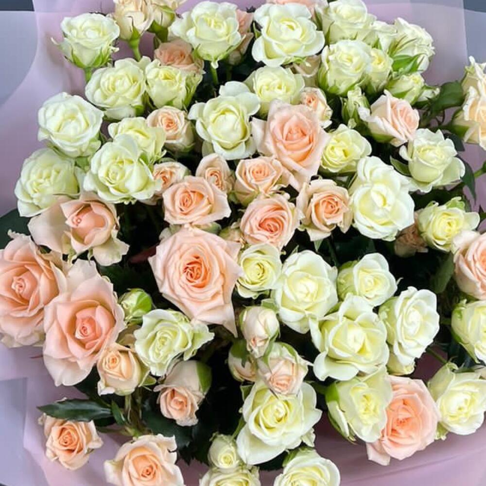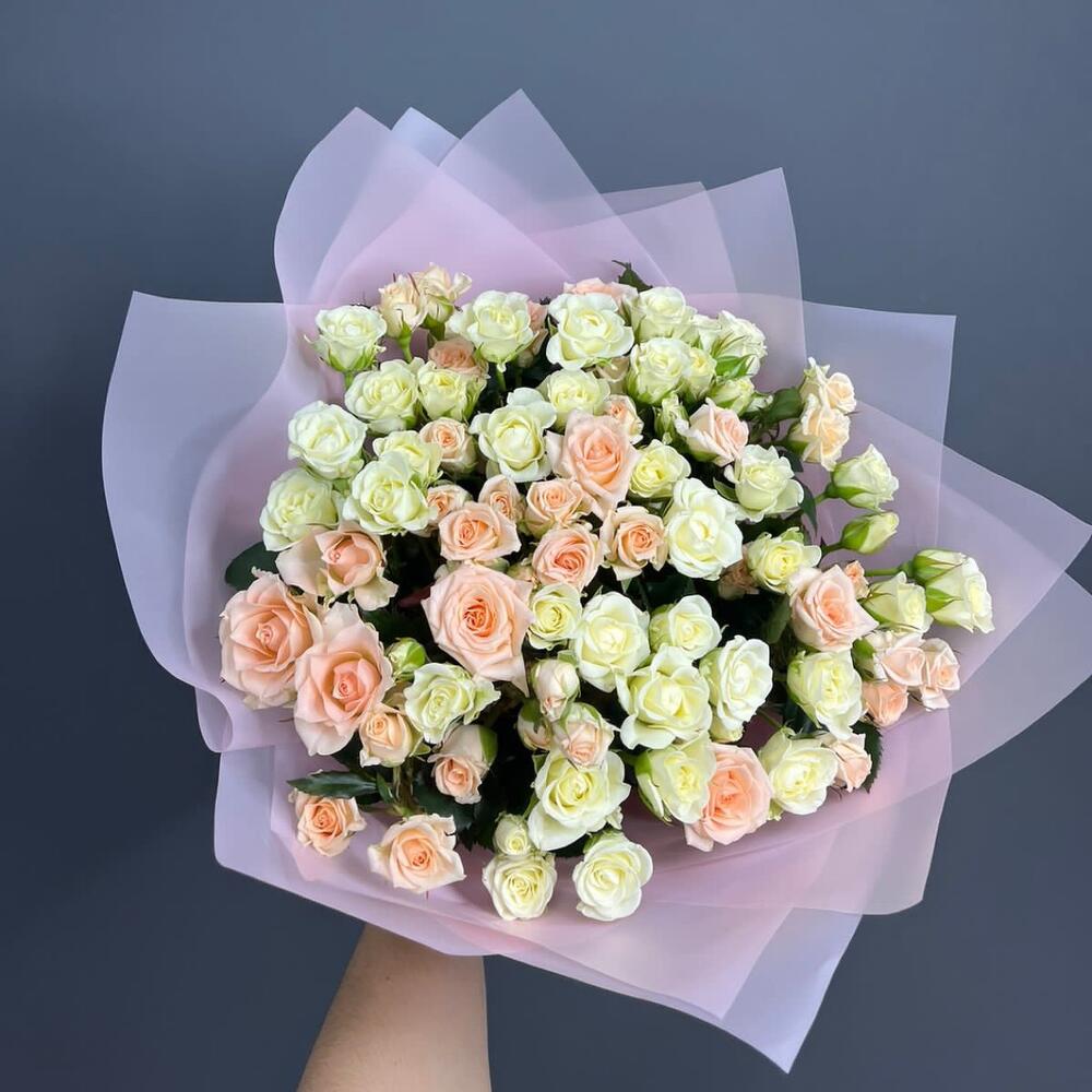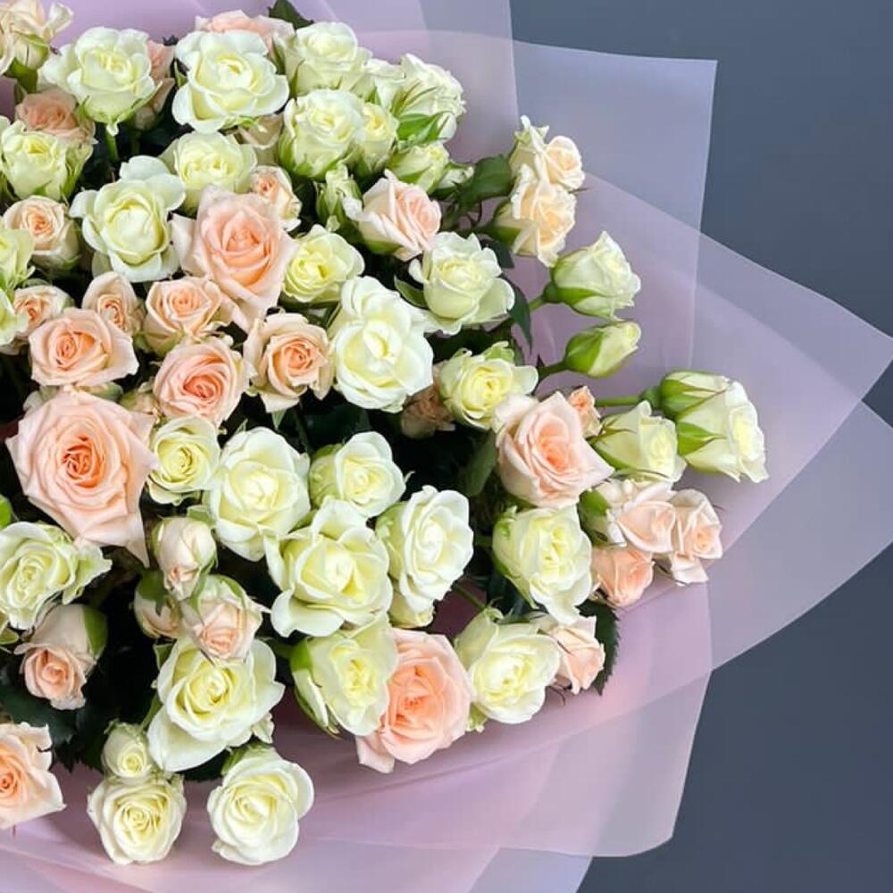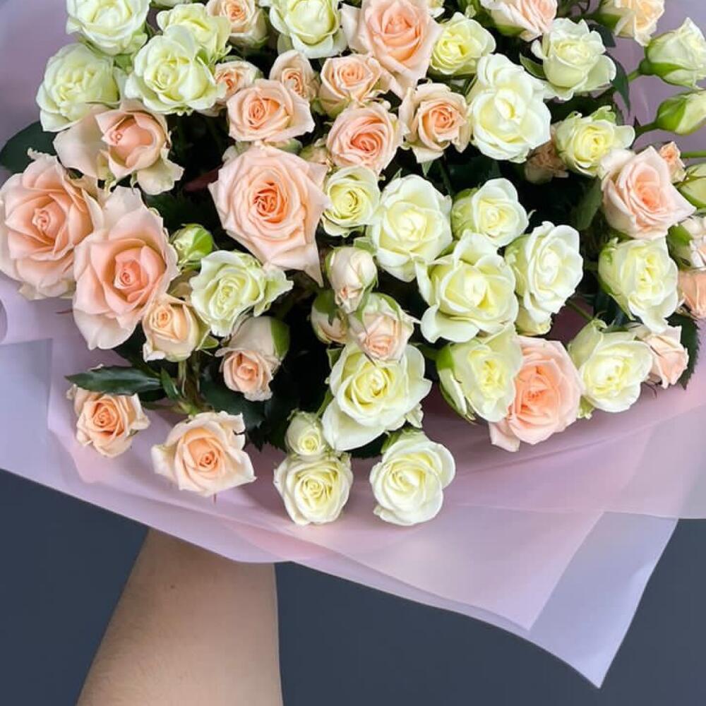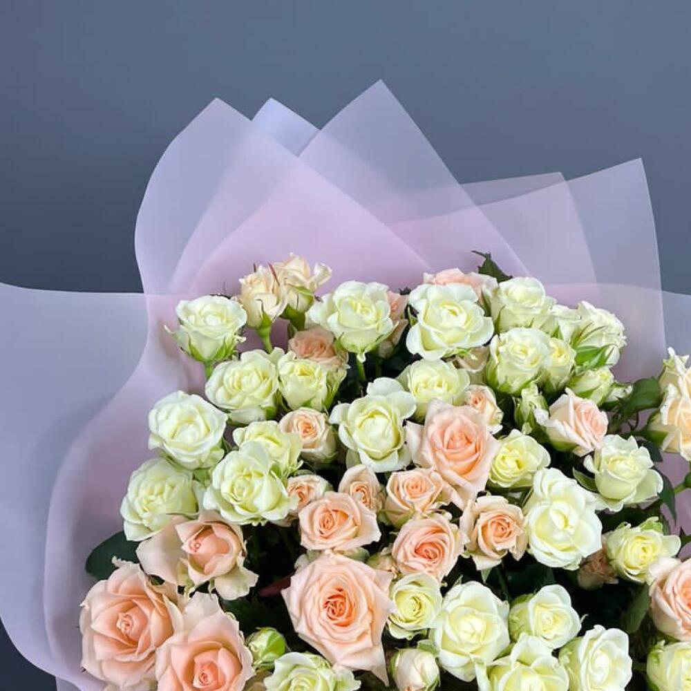Кустовая роза — 17 шт Атласная лента — 2 шт Матовая упаковка — 2 шт