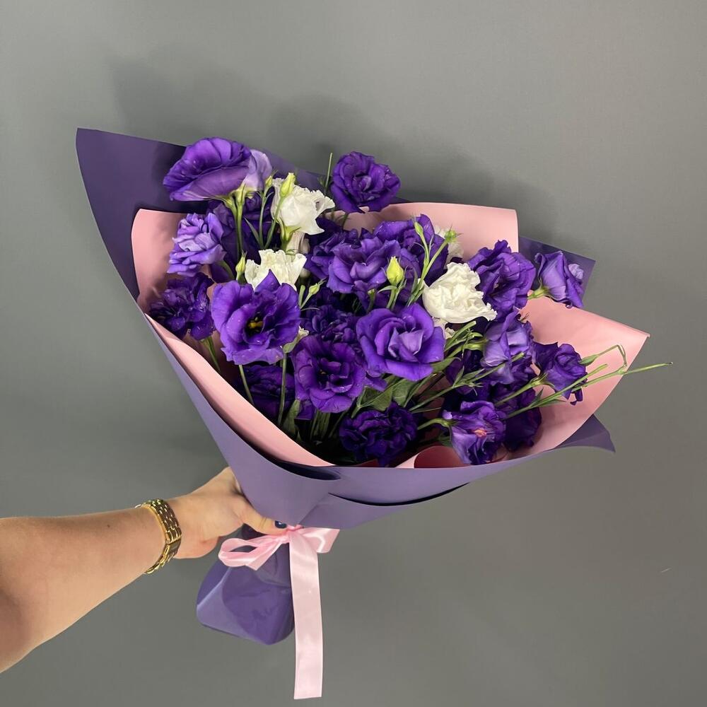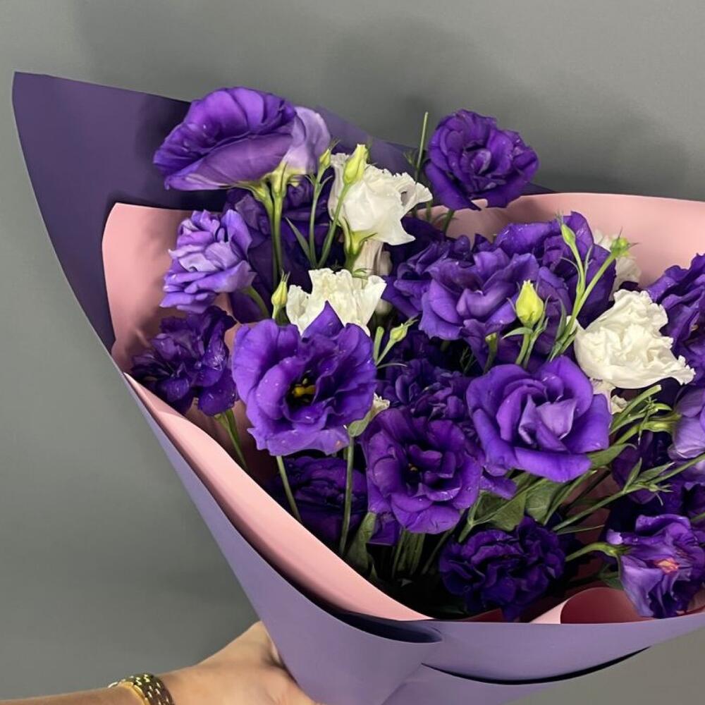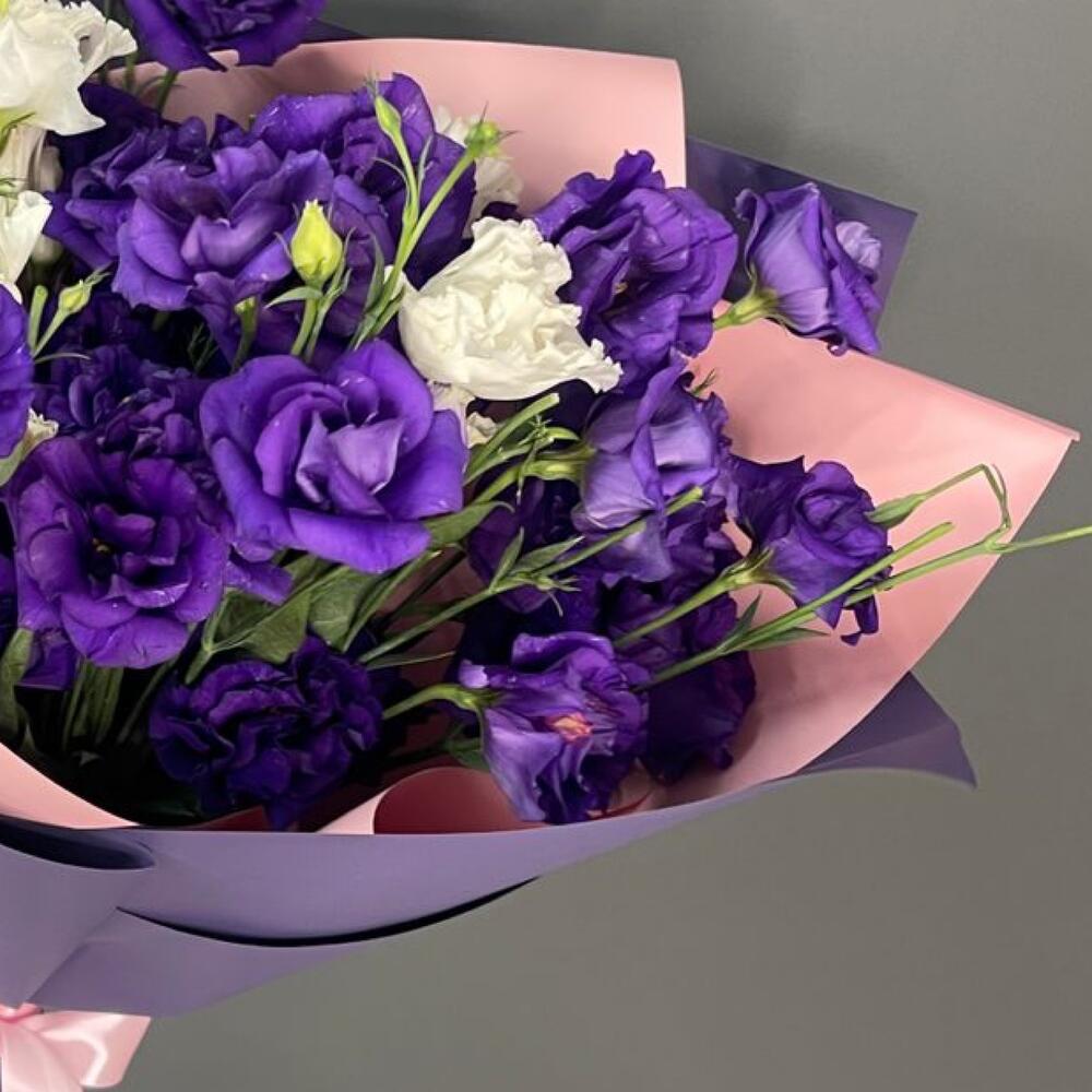 • Каждый цветок этого букета наполнен грацией и изяществом, создавая атмосферу загадочности и романтики. Немного белой эустомы добавляет свежести и легкости к композиции. Двухцветная упаковка фиолетового и телесного цвета придает букету особую изысканность и шарм.