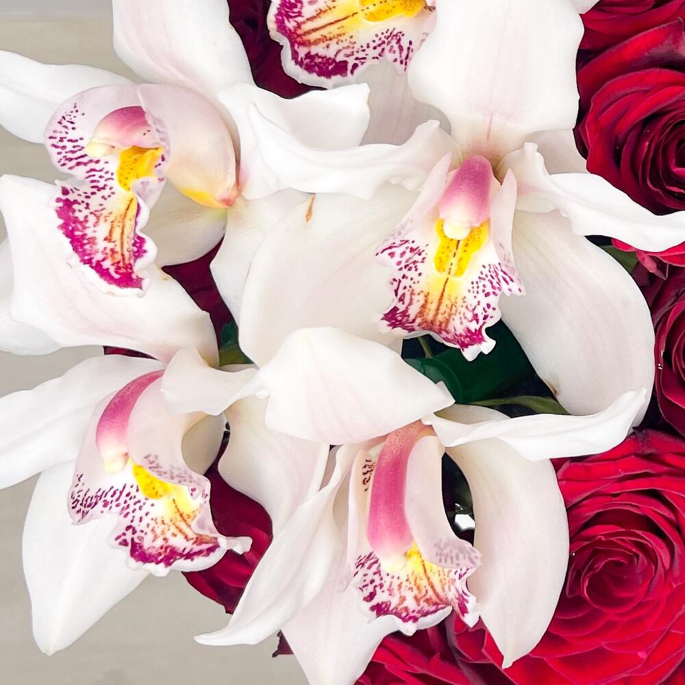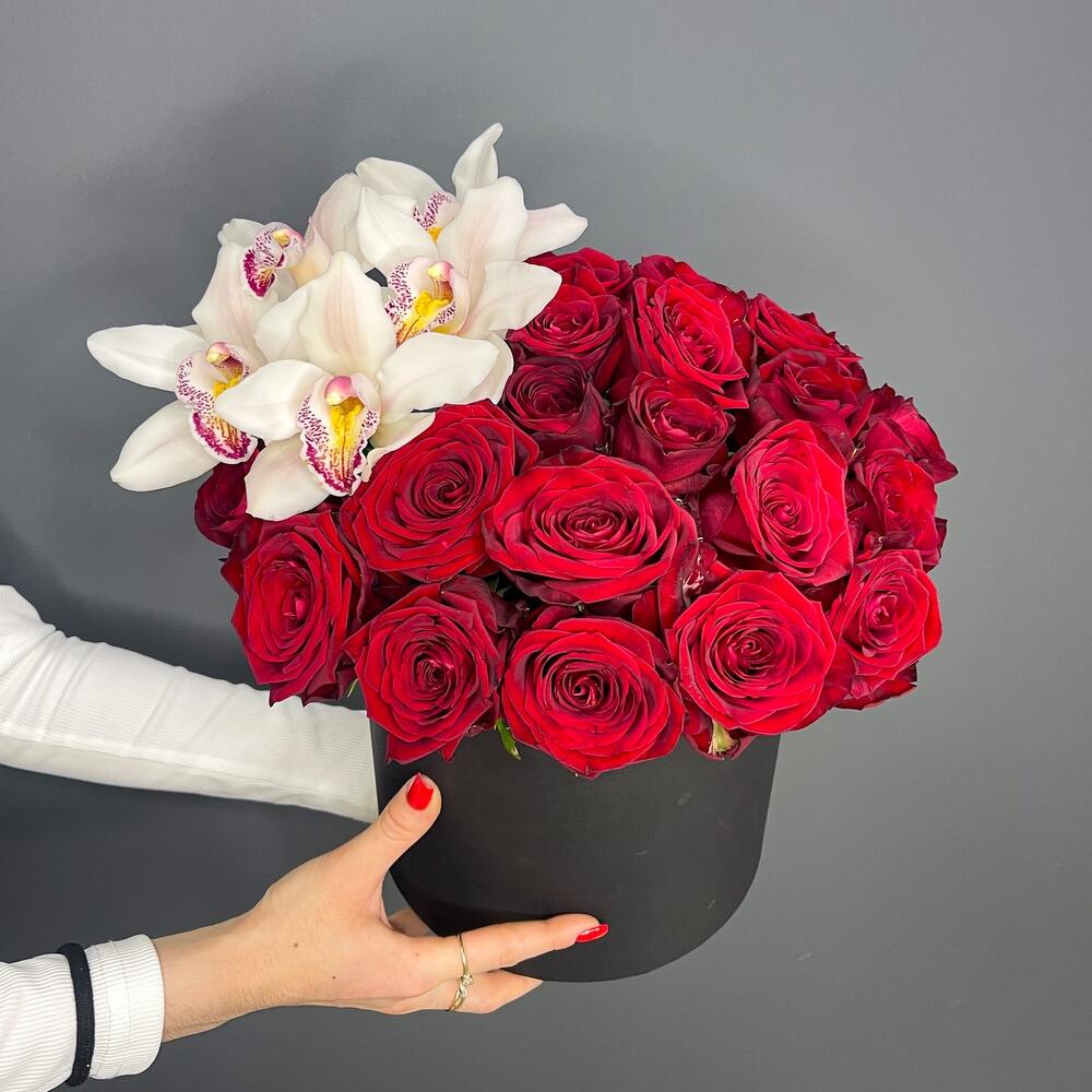 Роза — 25 шт Орхидея Цимбидиум — 5 шт Коробка шляпная — 1 шт