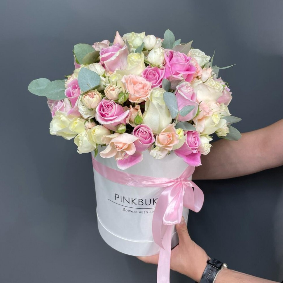 - Великолепная шляпная коробка — настоящее произведение искусства. В ней собраны самые красивые цветы — кенийская роза и кустовая роза в разных цветах нежной гаммы.