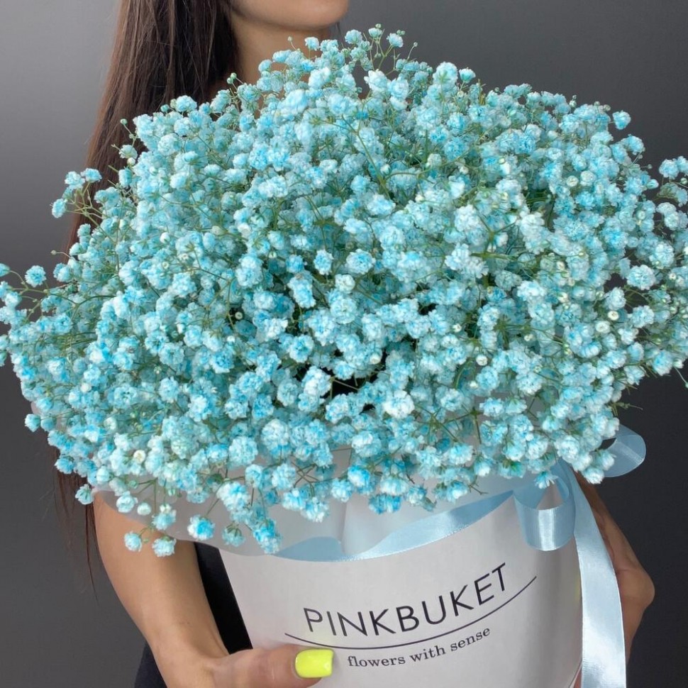 • Эта великолепная шляпная коробка с голубой гипсофилой и бантом — это настоящее произведение искусства.