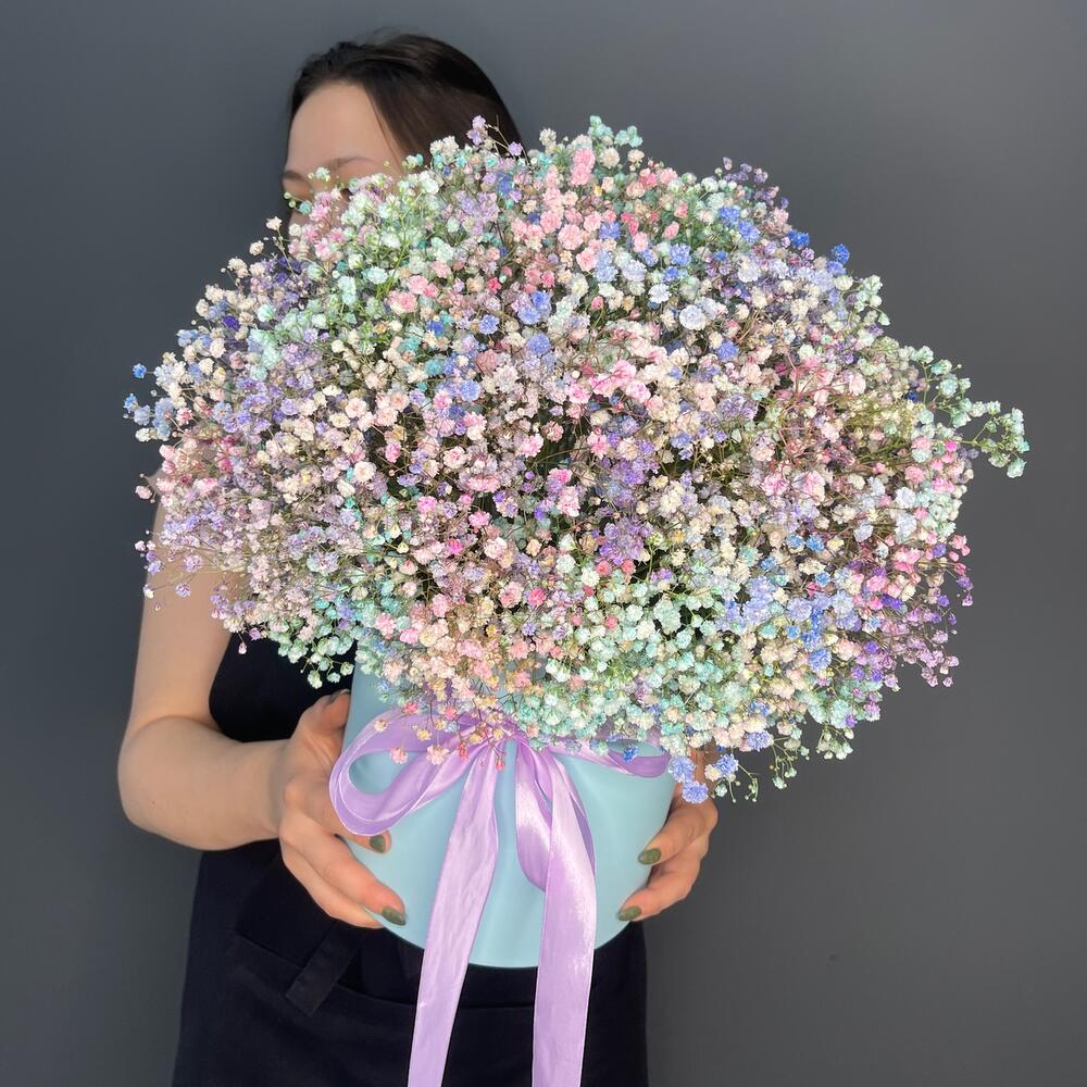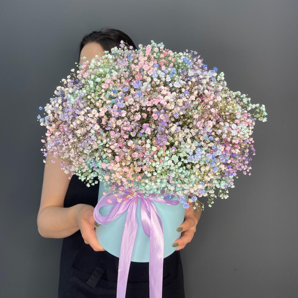 - Эта коробочка из 17 гипсофил цвета радуги — это настоящее произведение искусства.