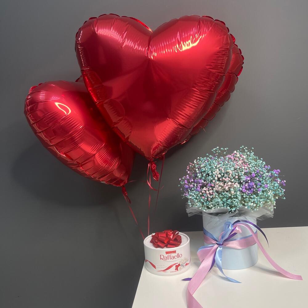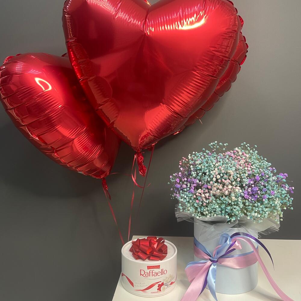 Гипсофила — 13 шт Коробка шляпная — 1 шт Конфеты Raffaello — 1 шт Шар — 3 шт