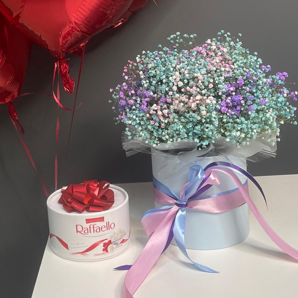 - Комплект также включает в себя коробочку с гипсофилой радужной и рафаэлло с красивым красным бантом, чтобы полностью завершить ваш праздник.