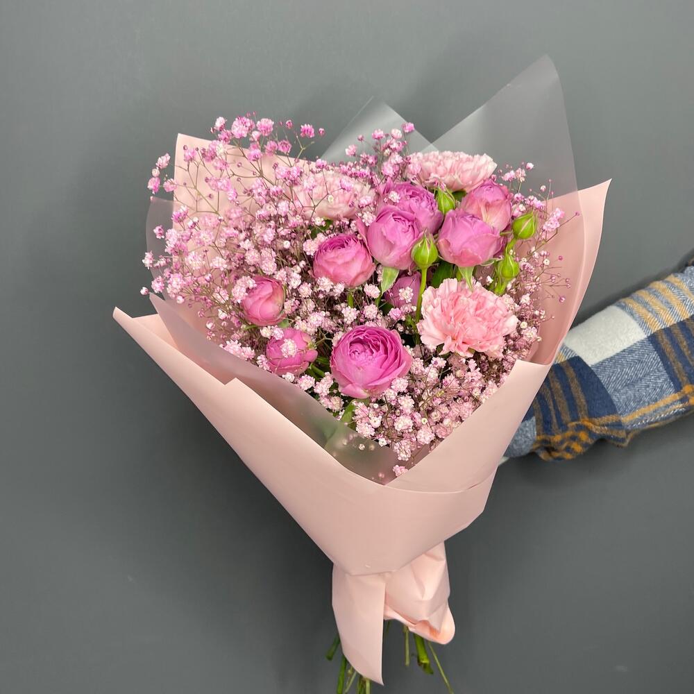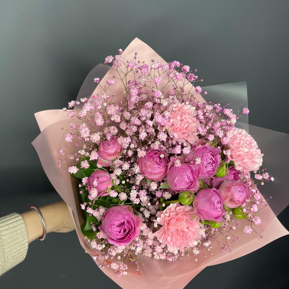 - Букет из трех розовых гипсофил, трех розовых диантусов и трех роз пионовидных роз мисти – это идеальный подарок для того, кто ценит красоту и изысканность. Он станет прекрасным подарком для любого случая – от дня рождения до свадьбы или просто желания выразить свою любовь и уважение.