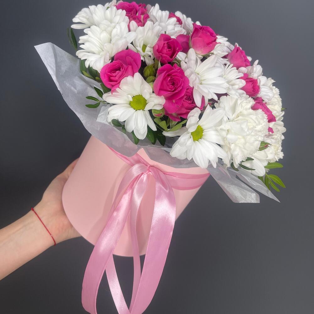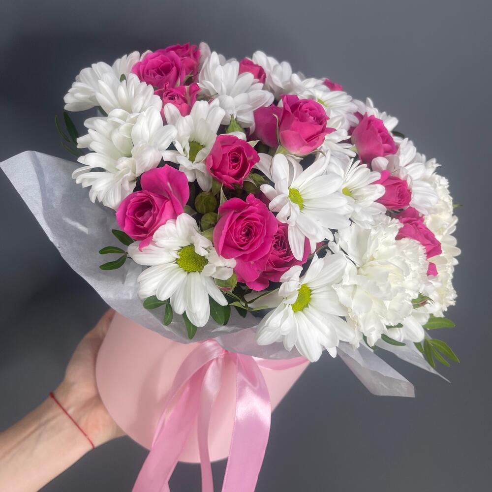 Кустовая роза — 5 шт Кустовая хризантема — 3 шт Диантус — 3 шт Коробка шляпная — 1 шт