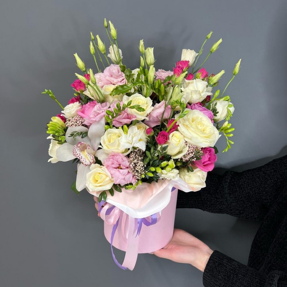 - Этот букет в коробке — настоящее произведение искусства, созданное из самых изысканных цветов.