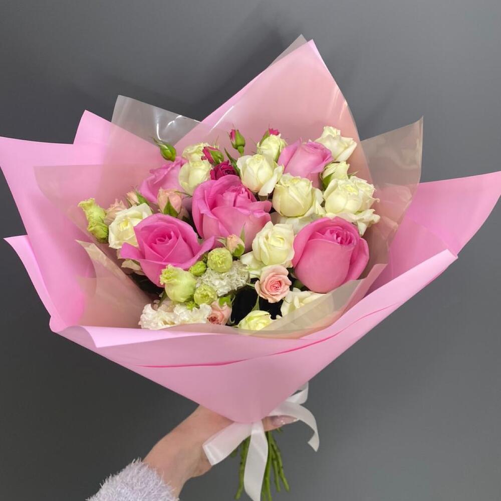 • Этот нежный и романтичный букет из пяти красивых роз, четырех кустовых роз и одной изящной эустомы в прекрасной розовой и прозрачной матовой упаковке — это настоящее произведение искусства.