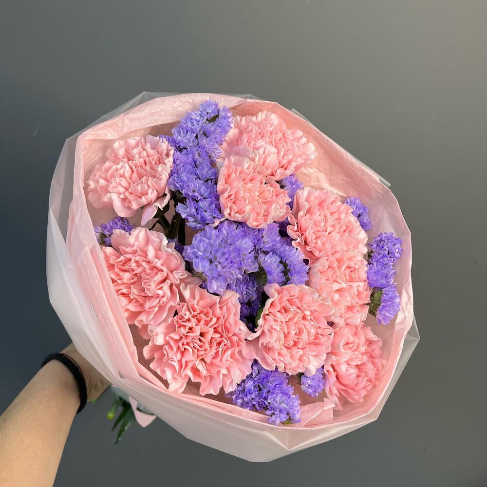 Подарите эмоции с букетом Love: гвоздики подчеркнут искренность чувств, а статица добавит элегантности. Бесплатная доставка в день заказа!