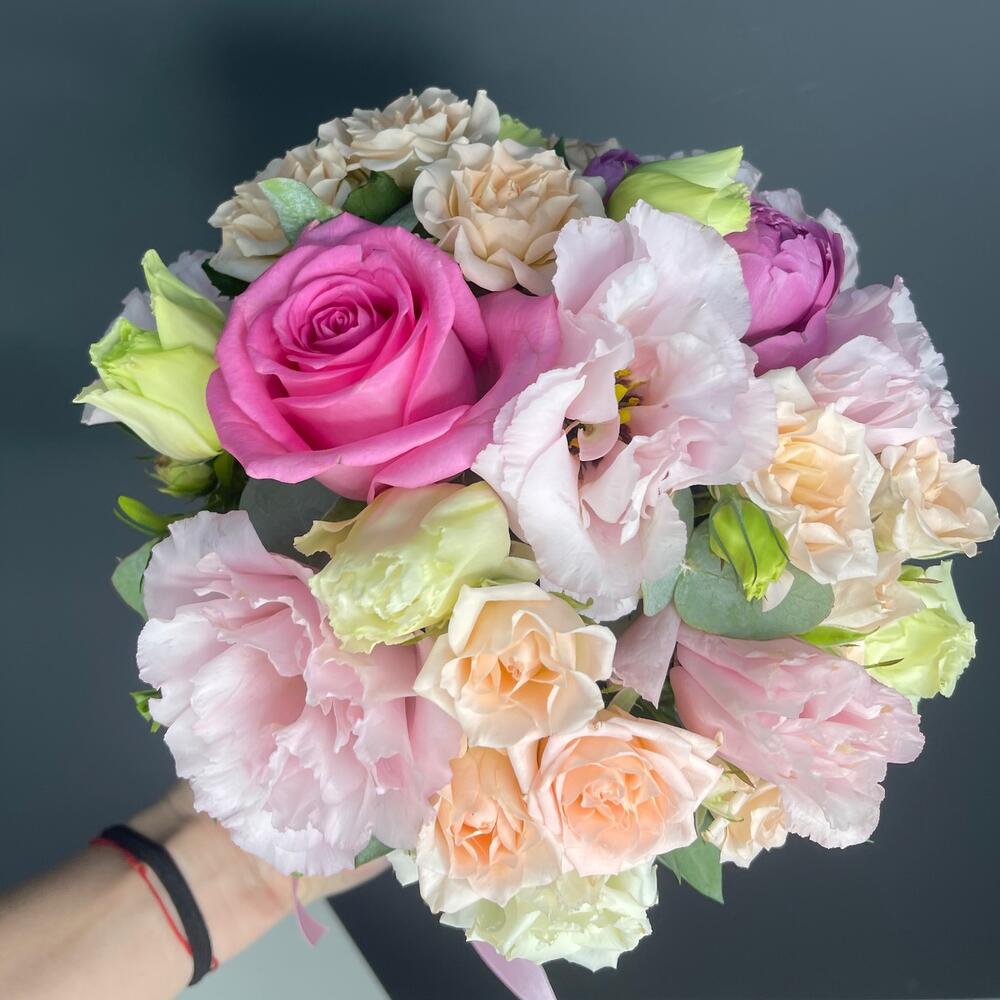 - Эустома добавляет изысканности и легкости, а розы и кустовые розы создают ощущение роскоши и романтики. Нежные тона букета придают ему особую нежность и шарм, наполняя ваше пространство атмосферой уюта и спокойствия.