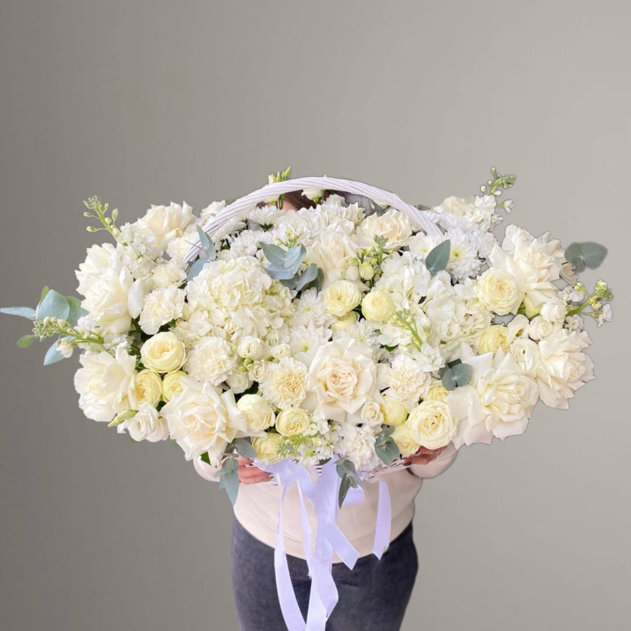 • Французские розы, 13 эустом, 11 хризантем кустовых, 11 маттиол, 9 гвоздик, 7 гортензий и 3 веточки эвкалипта.