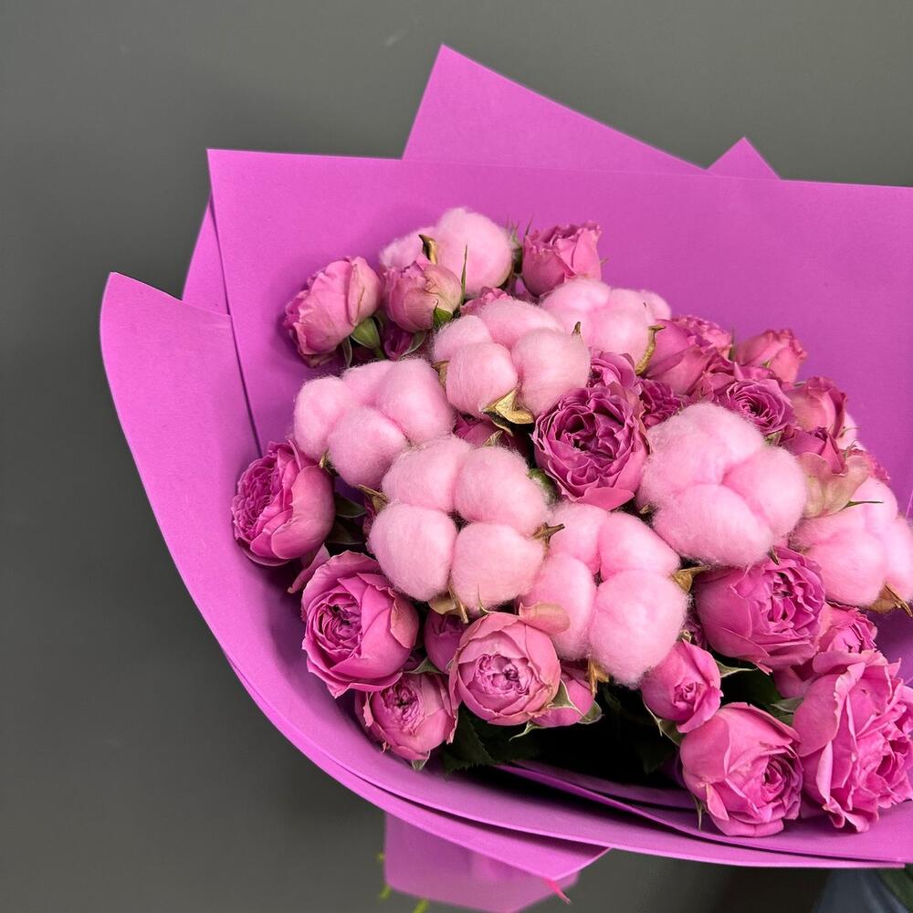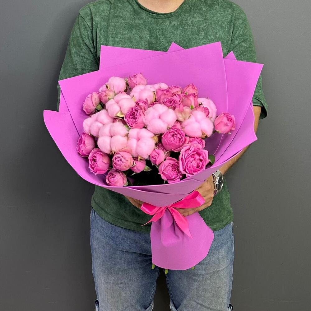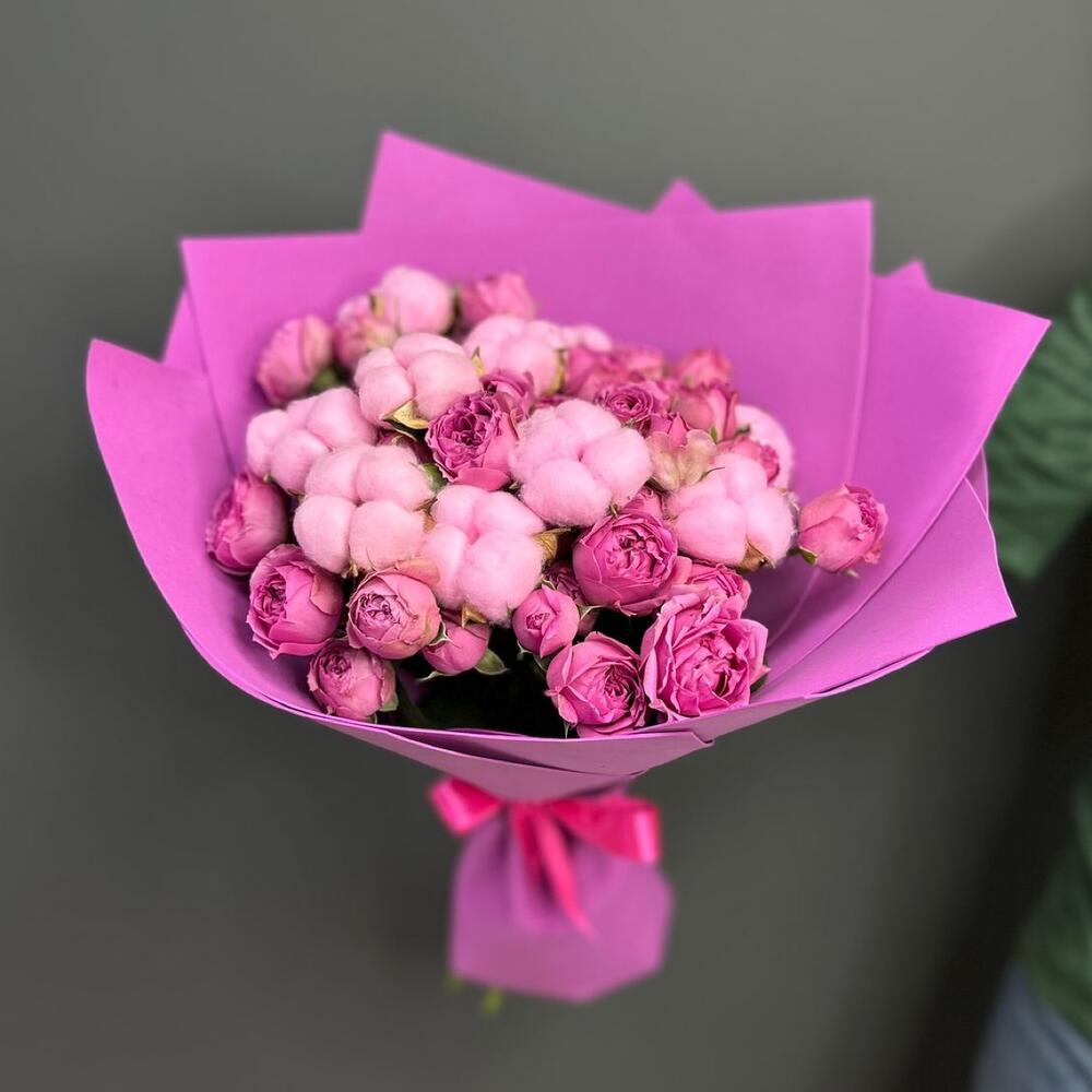 • Изысканный букет, сочетающий 10 нежных розовых хлопков и 7 пышных пионовидных Misty Bubbles.
