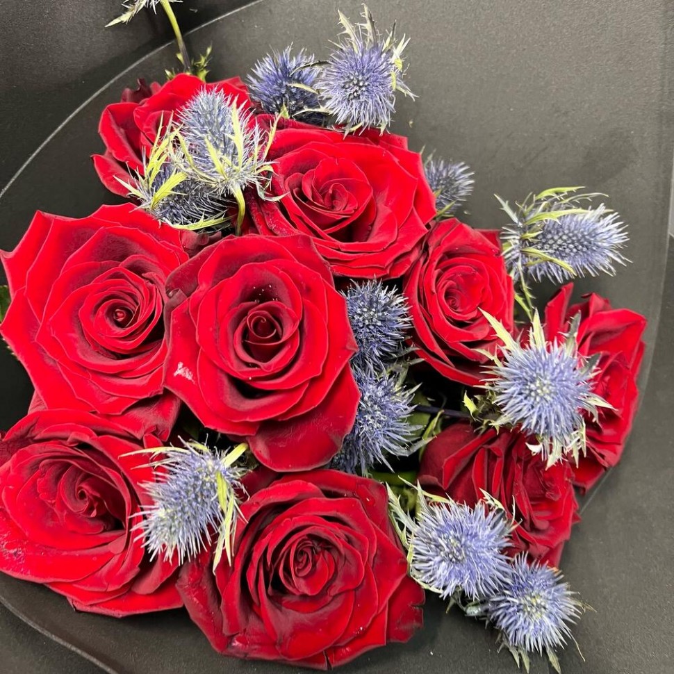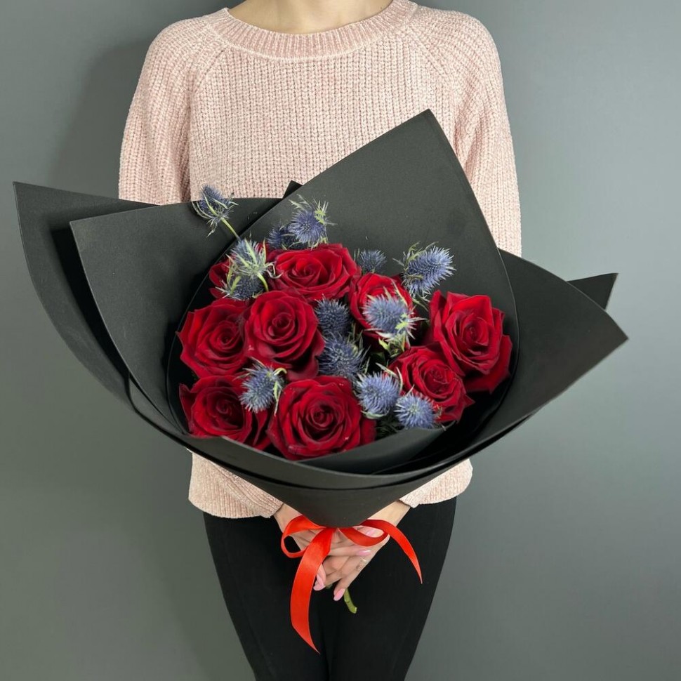 - Этот букет из девяти красных роз с эрингиумом в черной упаковке — это идеальный выбор для тех, кто ищет необычный и оригинальный подарок.