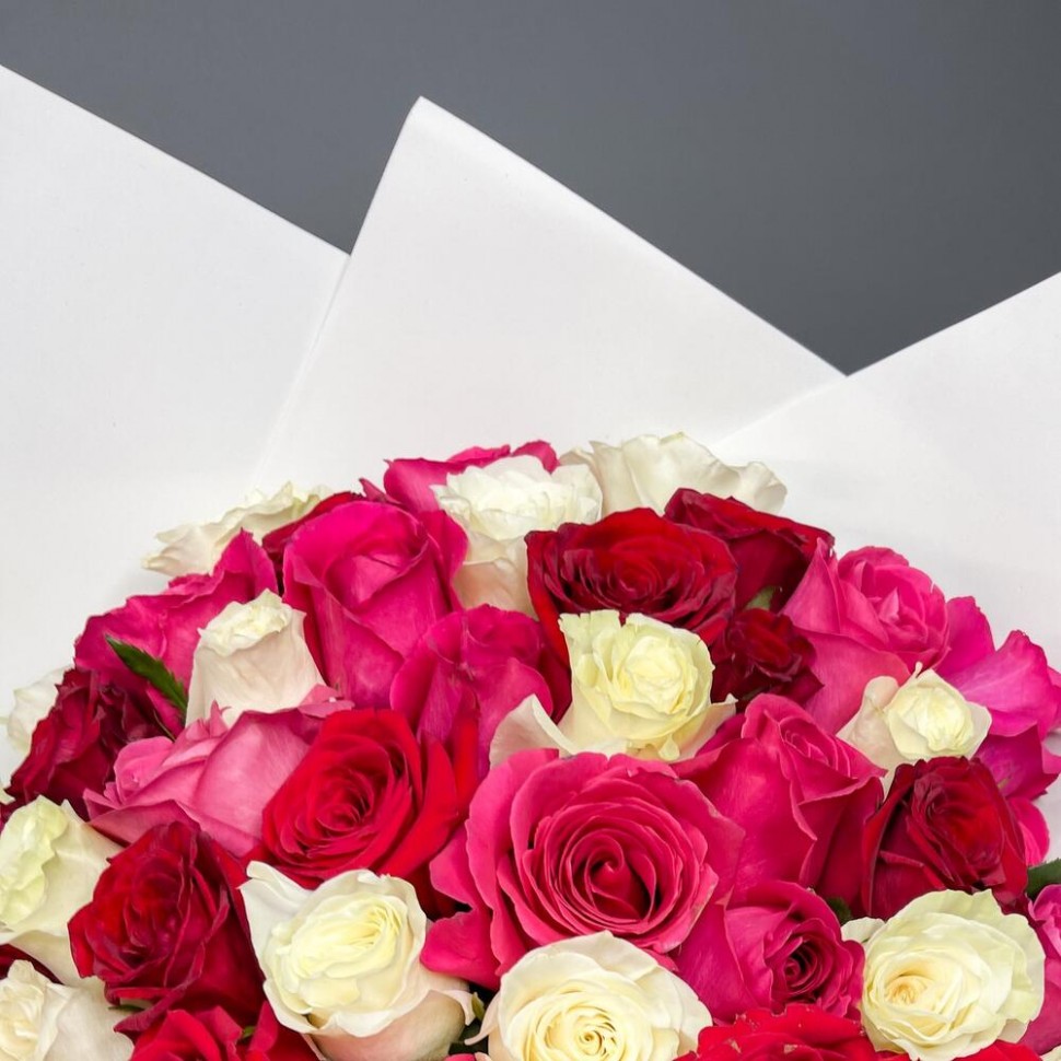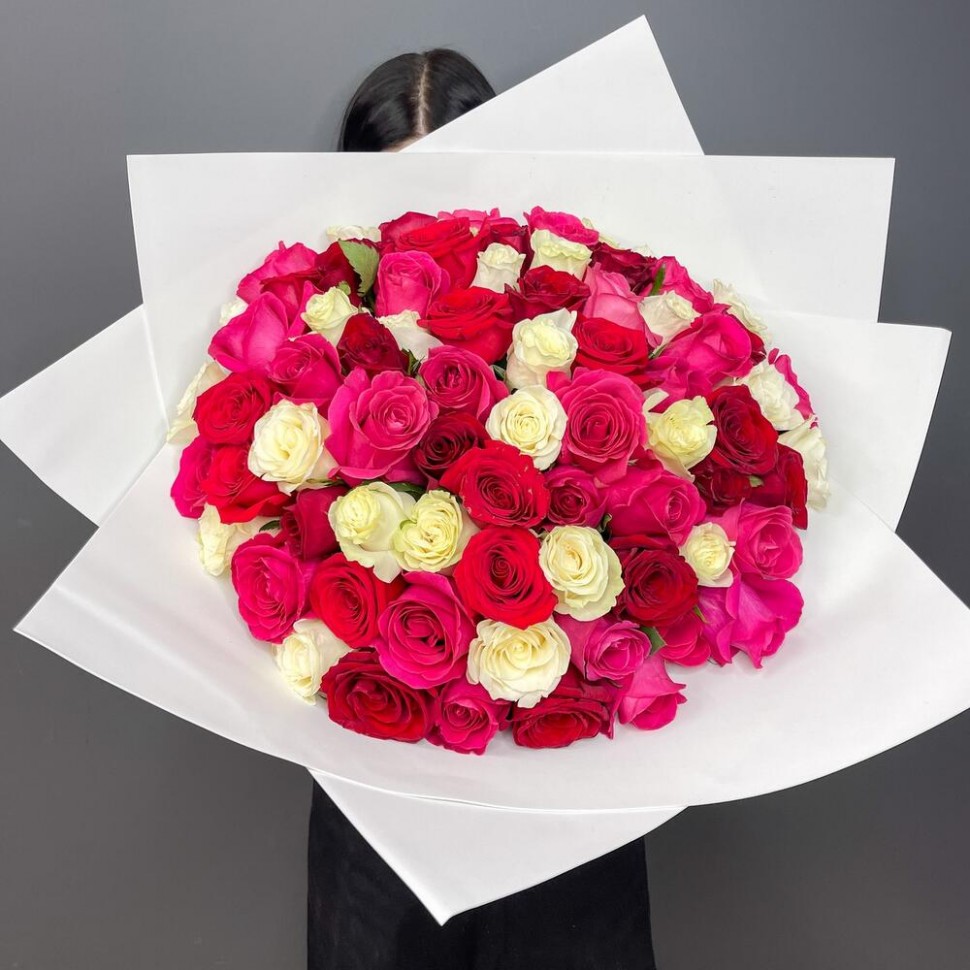 • Этот букет из 75 роз — настоящее произведение искусства, которое оставит вас без ума. Красивые розовые, белые и красные цветы сочетаются в элегантном танце, создавая неповторимую атмосферу романтики и чувственности. Букет упакован в белый фоамиран, что придает ему особую изысканность и элегантность.
