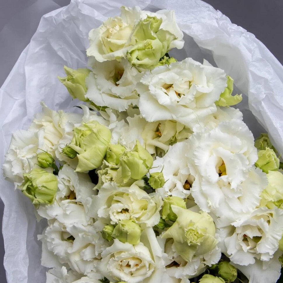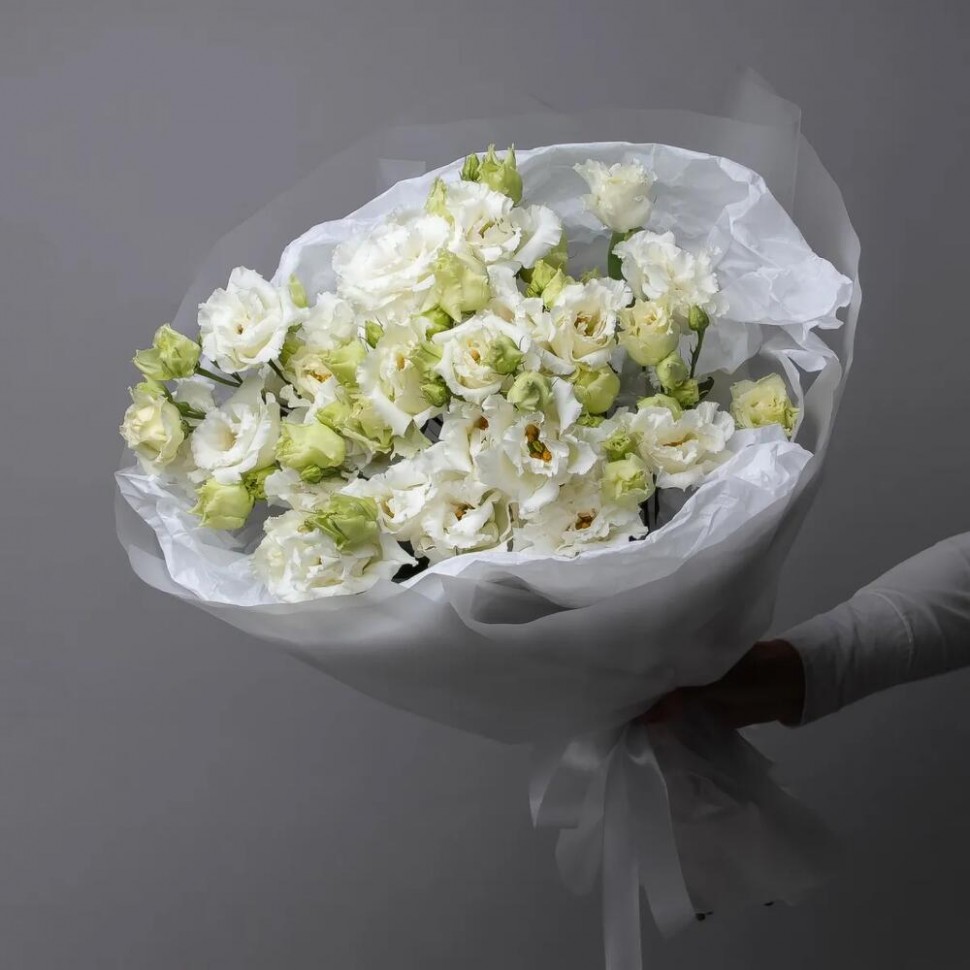 - Этот букет из белой эустомы — это настоящее произведение искусства, которое поразит вас своей изысканностью и нежностью.
