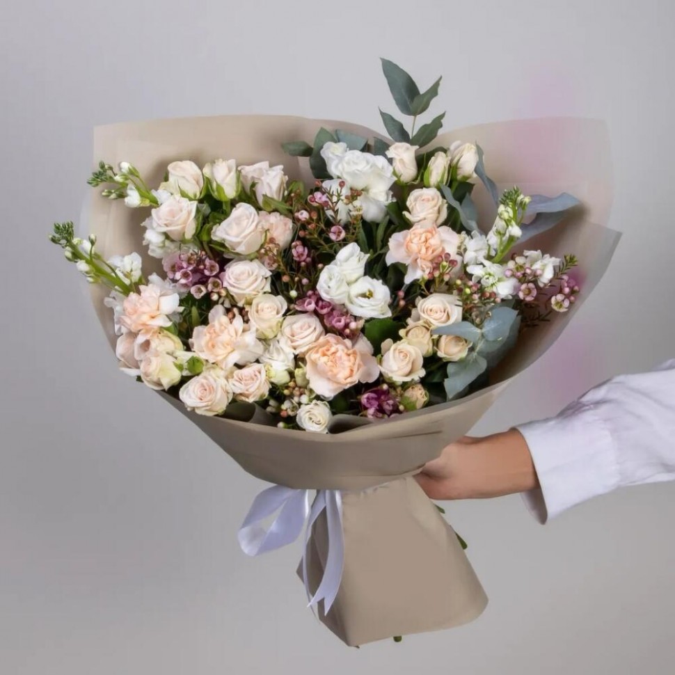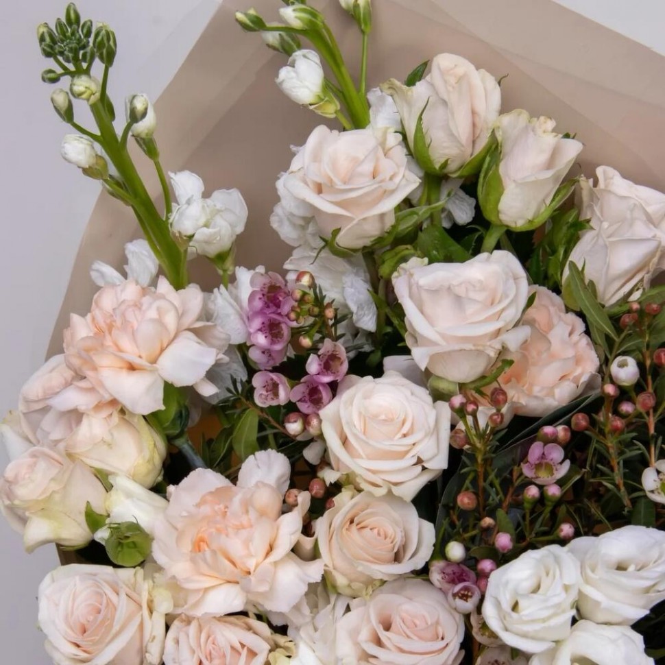Хамелациум — 3 шт Эустома — 5 шт Диантус — 4 шт Кустовая роза — 11 шт